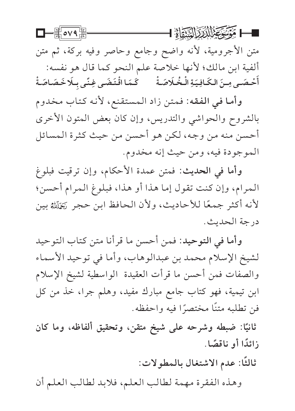 وأما في التوحيد: فمن أحسن ما قرأنا متن كتاب التوحيد لشيخ الإسلام محمد بن عبدالوهاب، وأما في توحيد الأسماء والصفات فمن أحسن ما قرأت العقيدة الواسطية لشيخ الإسلام ابن تيمية، فهو كتاب جامع مبارك مفيد، وهلم جرا، خذ من كل فن تطلبه متنًا مختصرًا فيه واحفظه.