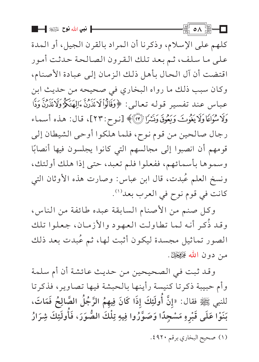 كلهم على الإسلام، وذكرنا أن المراد بالقرن الجيل، أو المدة على ما سلف، ثم بعد تلك القرون الصالحة حدثت أمور اقتضت أن آل الحال بأهل ذلك الزمان إلى عبادة الأصنام، وكان سبب ذلك ما رواه البخاري في صحيحه من حديث ابن عباس عند تفسير قوله تعالى: {وَقَالُوا لَا تَذَرُنَّ آلِهَتَكُمْ وَلَا تَذَرُنَّ وَدًّا وَلَا سُوَاعًا وَلَا يَغُوثَ وَيَعُوقَ وَنَسْرًا (٢٣)} [نوح:٢٣]، قال: هذه أسماء رجال صالحين من قوم نوح، فلما هلكوا أوحى الشيطان إلى قومهم أن انصبوا إلى مجالسهم التي كانوا يجلسون فيها أنصابًا وسموها بأسمائهم، ففعلوا فلم تعبد، حتى إذا هلك أولئك، ونسخ العلم عُبدت، قال ابن عباس: وصارت هذه الأوثان التي كانت في قوم نوح في العرب بعد (¬١).