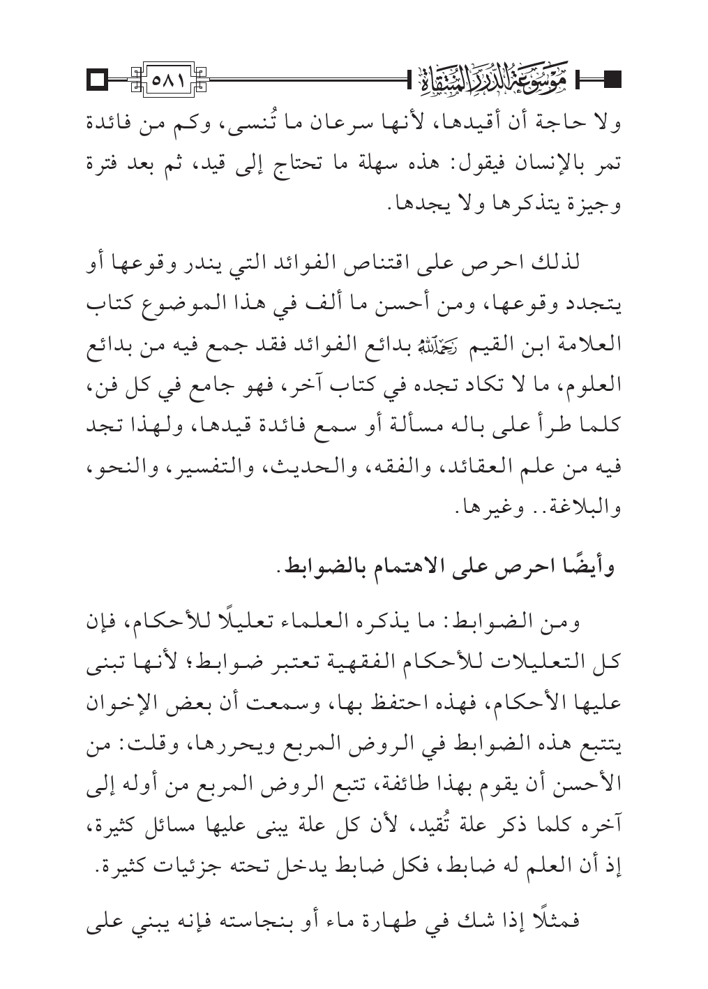 ومن الضوابط: ما يذكره العلماء تعليلًا للأحكام، فإن كل التعليلات للأحكام الفقهية تعتبر ضوابط؛ لأنها تبنى عليها الأحكام، فهذه احتفظ بها، وسمعت أن بعض الإخوان يتتبع هذه الضوابط في الروض المربع ويحررها، وقلت: من الأحسن أن يقوم بهذا طائفة، تتبع الروض المربع من أوله إلى آخره كلما ذكر علة تُقيد، لأن كل علة يبنى عليها مسائل كثيرة، إذ أن العلم له ضابط، فكل ضابط يدخل تحته جزئيات كثيرة.