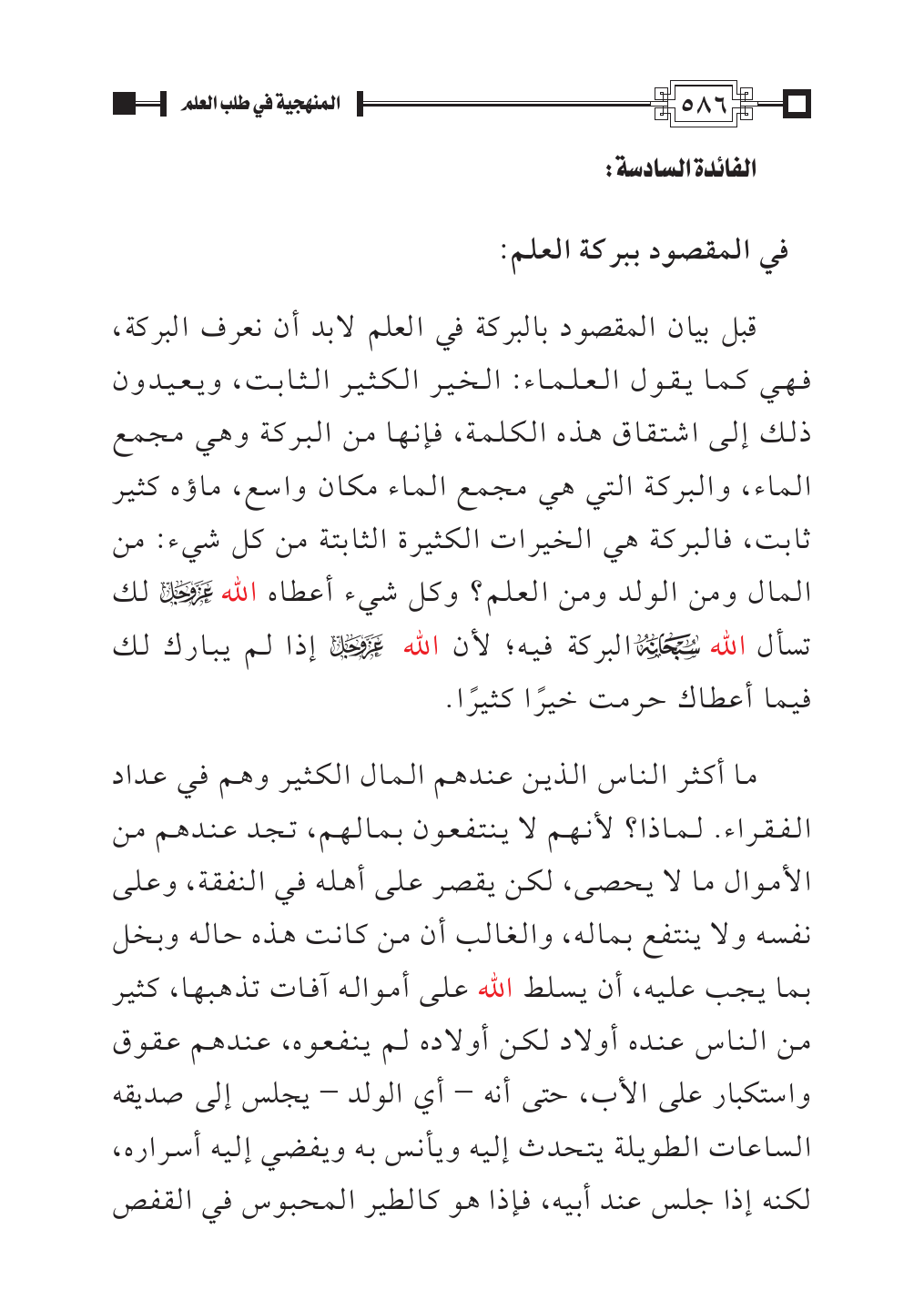 قبل بيان المقصود بالبركة في العلم لابد أن نعرف البركة، فهي كما يقول العلماء: الخير الكثير الثابت، ويعيدون ذلك إلى اشتقاق هذه الكلمة، فإنها من البركة وهي مجمع الماء، والبركة التي هي مجمع الماء مكان واسع، ماؤه كثير ثابت، فالبركة هي الخيرات الكثيرة الثابتة من كل شيء: من المال ومن الولد ومن العلم؟ وكل شيء أعطاه الله - عز وجل - لك تسأل الله - سُبْحَانَهُ - البركة فيه؛ لأن الله - عز وجل - إذا لم يبارك لك فيما أعطاك حرمت خيرًا كثيرًا.
