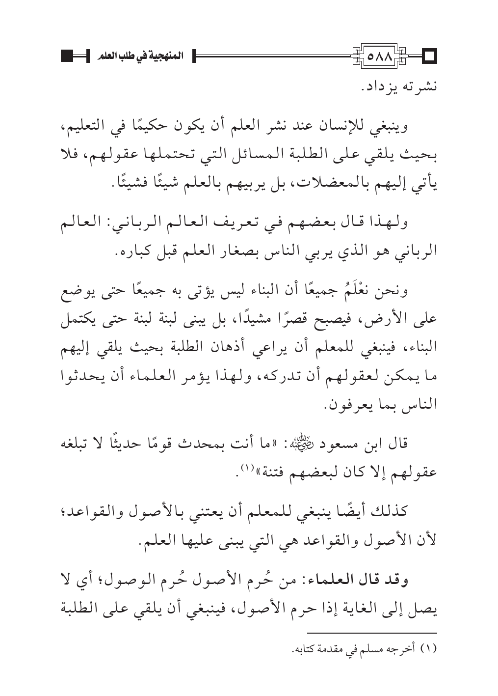 وينبغي للإنسان عند نشر العلم أن يكون حكيمًا في التعليم، بحيث يلقي على الطلبة المسائل التي تحتملها عقولهم، فلا يأتي إليهم بالمعضلات، بل يربيهم بالعلم شيئًا فشيئًا.