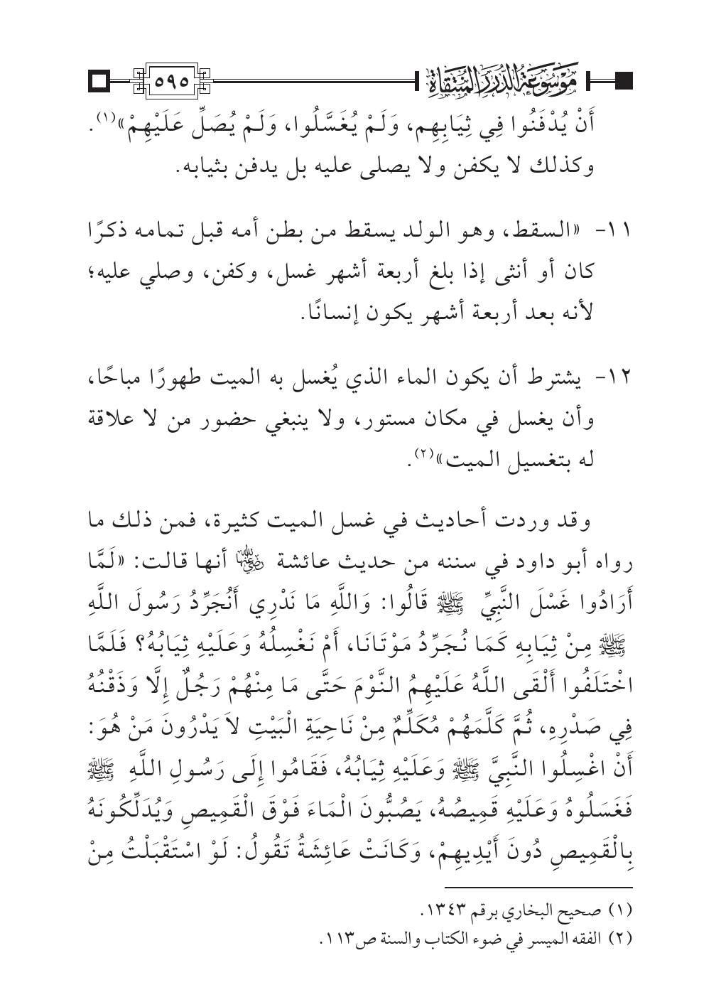 ١١ - «السقط، وهو الولد يسقط من بطن أمه قبل تمامه ذكرًا كان أو أنثى إذا بلغ أربعة أشهر غسل، وكفن، وصلي عليه؛ لأنه بعد أربعة أشهر يكون إنسانًا.