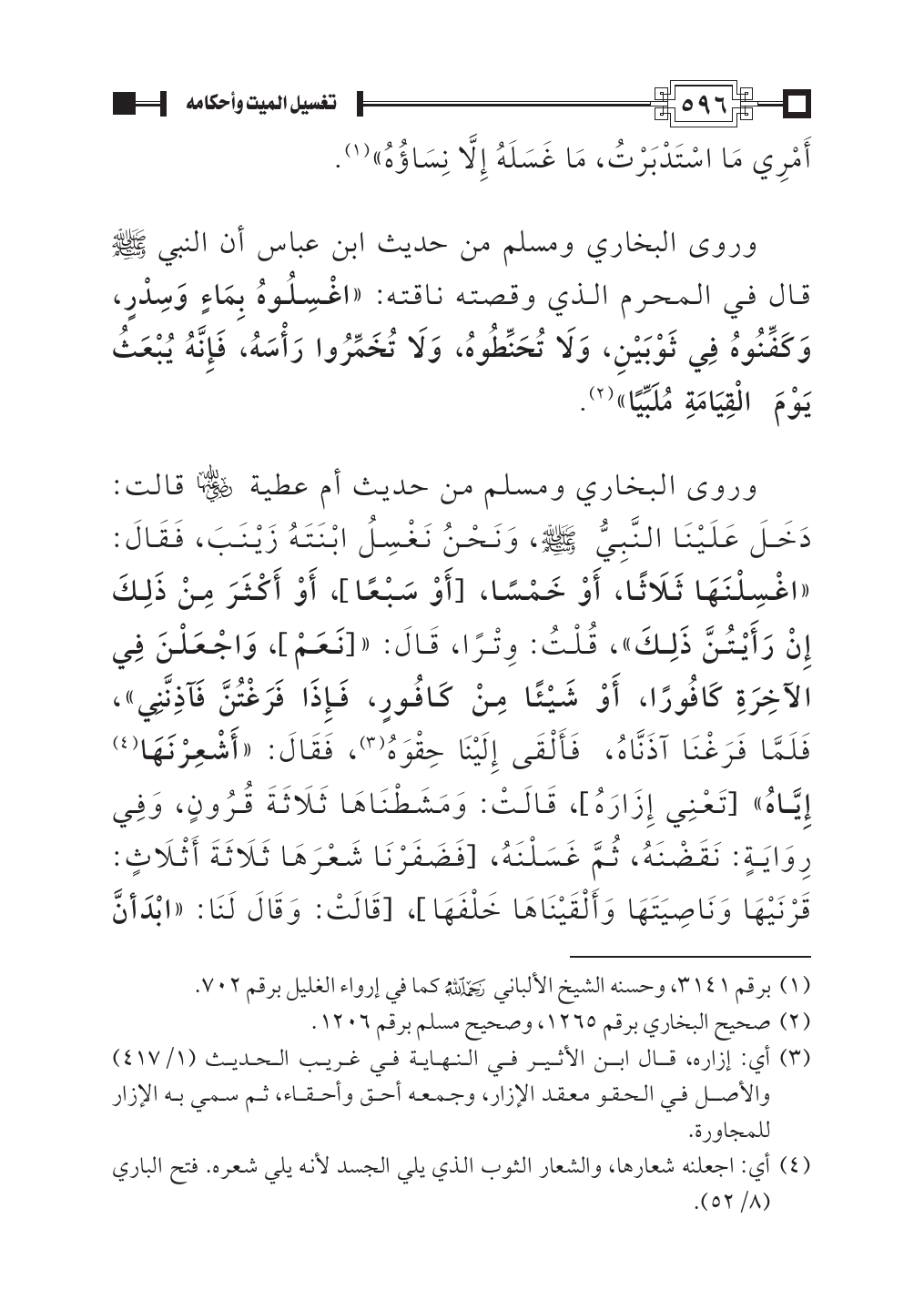 وروى البخاري ومسلم من حديث أم عطية - رضي الله عنها - قالت: دَخَلَ عَلَيْنَا النَّبِيُّ - صلى الله عليه وسلم -، وَنَحْنُ نَغْسِلُ ابْنَتَهُ زَيْنَبَ، فَقَالَ: «اغْسِلْنَهَا ثَلَاثًا، أَوْ خَمْسًا،] أَوْ سَبْعًا [، أَوْ أَكْثَرَ مِنْ ذَلِكَ إِنْ رَأَيْتُنَّ ذَلِكَ»، قُلْتُ: وِتْرًا، قَالَ: «] نَعَمْ [، وَاجْعَلْنَ فِي الآخِرَةِ كَافُورًا، أَوْ شَيْئًا مِنْ كَافُورٍ، فَإِذَا فَرَغْتُنَّ فَآذِنَّنِي»، فَلَمَّا فَرَغْنَا آذَنَّاهُ، فَأَلْقَى إِلَيْنَا حِقْوَهُ (¬٣)، فَقَالَ: «أَشْعِرْنَهَا (¬٤) إِيَّاهُ»] تَعْنِي إِزَارَهُ [، قَالَتْ: وَمَشَطْنَاهَا ثَلَاثَةَ قُرُونٍ، وَفِي رِوَايَةٍ: نَقَضْنَهُ، ثُمَّ غَسَلْنَهُ،] فَضَفَرْنَا شَعْرَهَا ثَلَاثَةَ أَثْلَاثٍ: قَرْنَيْهَا وَنَاصِيَتَهَا وَأَلْقَيْنَاهَا خَلْفَهَا [،] قَالَتْ: وَقَالَ لَنَا: «ابْدَأنَّ