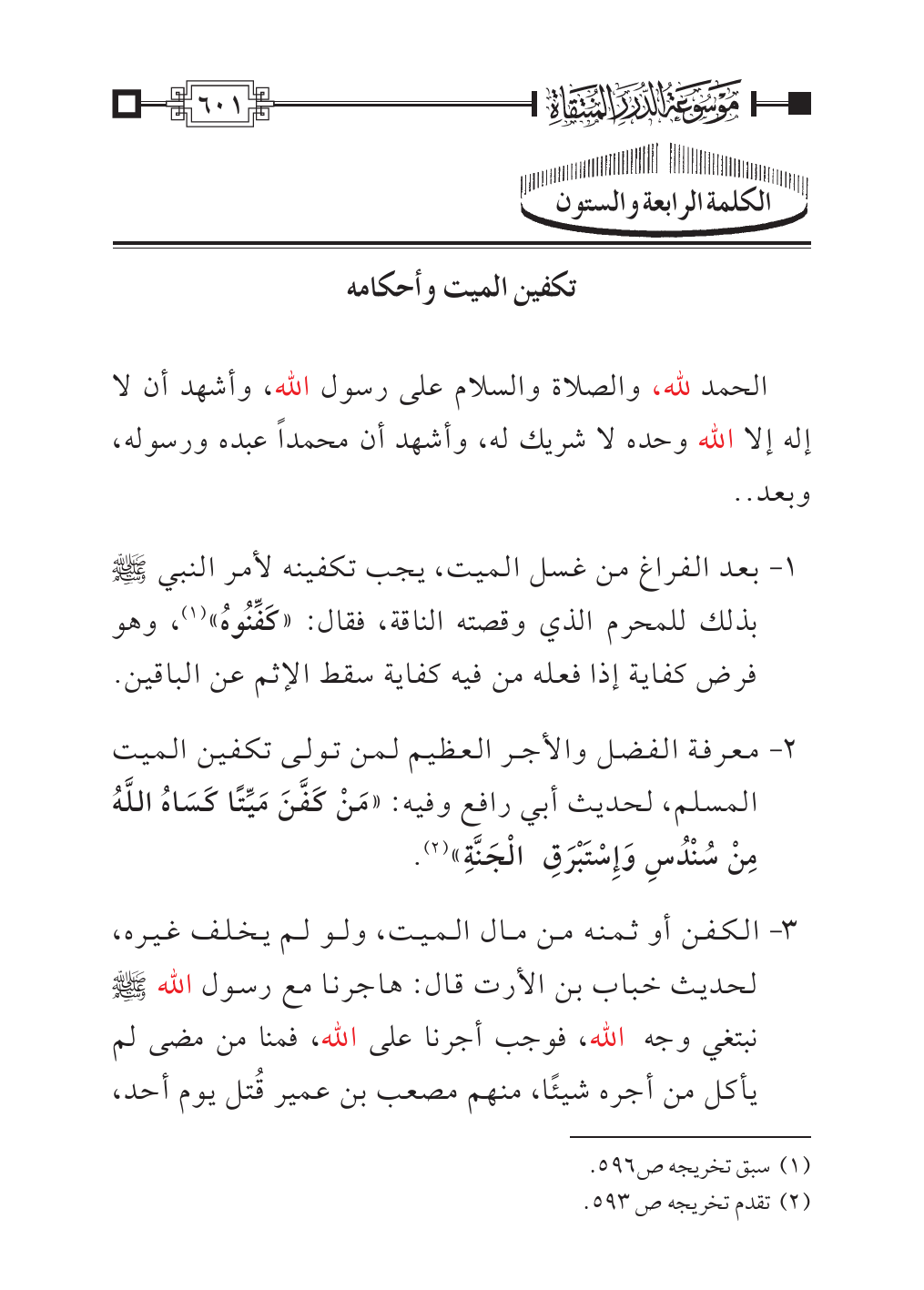 ١ - بعد الفراغ من غسل الميت، يجب تكفينه لأمر النبي - صلى الله عليه وسلم - بذلك للمحرم الذي وقصته الناقة، فقال: «كَفِّنُوهُ» (¬١)، وهو فرض كفاية إذا فعله من فيه كفاية سقط الإثم عن الباقين.