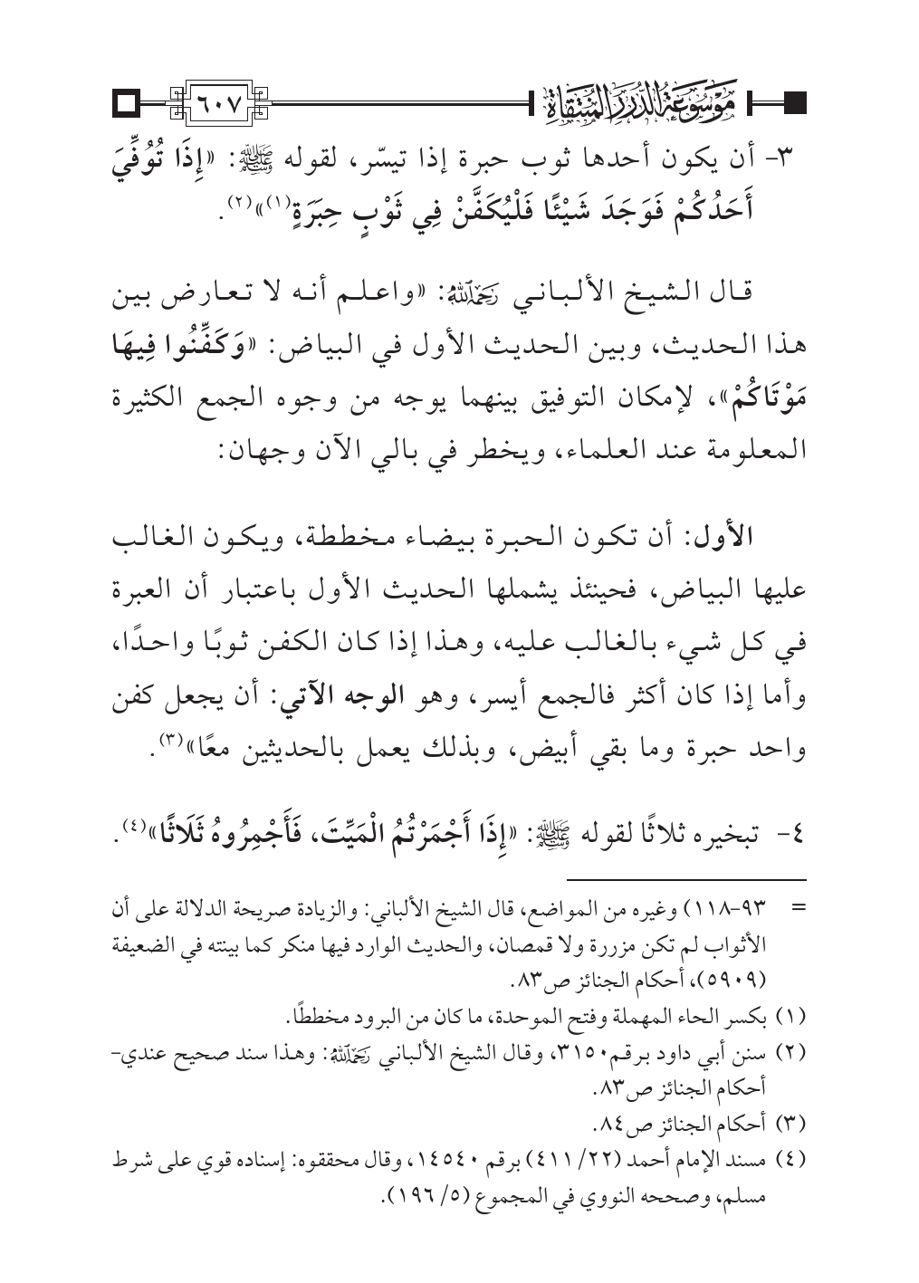 الأول: أن تكون الحبرة بيضاء مخططة، ويكون الغالب عليها البياض، فحينئذ يشملها الحديث الأول باعتبار أن العبرة في كل شيء بالغالب عليه، وهذا إذا كان الكفن ثوبًا واحدًا، وأما إذا كان أكثر فالجمع أيسر، وهو الوجه الآتي: أن يجعل كفن واحد حبرة وما بقي أبيض، وبذلك يعمل بالحديثين معًا» (¬٣).