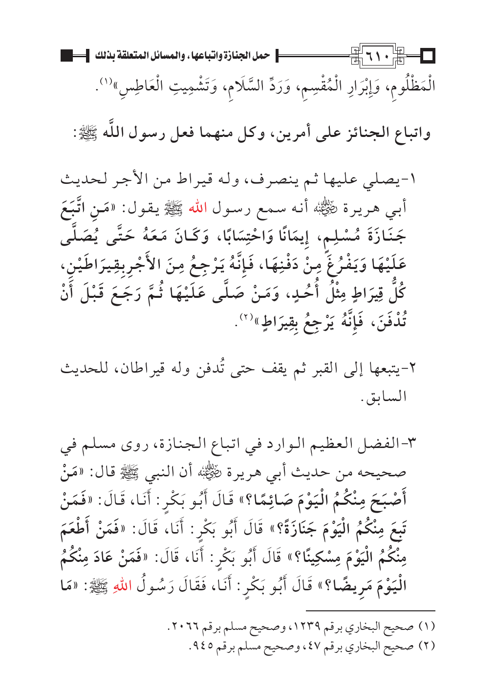 ٣ - الفضل العظيم الوارد في اتباع الجنازة، روى مسلم في صحيحه من حديث أبي هريرة - رضي الله عنه - أن النبي - صلى الله عليه وسلم - قال: «مَنْ أَصْبَحَ مِنْكُمُ الْيَوْمَ صَائِمًا؟» قَالَ أَبُو بَكْرٍ: أَنَا، قَالَ: «فَمَنْ تَبِعَ مِنْكُمُ الْيَوْمَ جَنَازَةً؟» قَالَ أَبُو بَكْرٍ: أَنَا، قَالَ: «فَمَنْ أَطْعَمَ مِنْكُمُ الْيَوْمَ مِسْكِينًا؟» قَالَ أَبُو بَكْرٍ: أَنَا، قَالَ: «فَمَنْ عَادَ مِنْكُمُ الْيَوْمَ مَرِيضًا؟» قَالَ أَبُو بَكْرٍ: أَنَا، فَقَالَ رَسُولُ اللهِ - صلى الله عليه وسلم -: «مَا