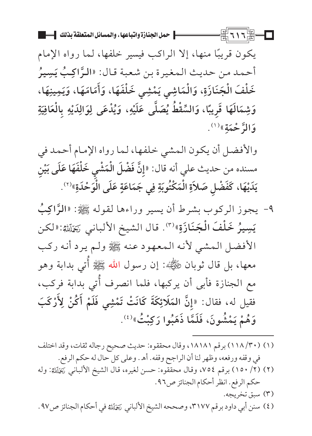 قال الشيخ الألباني - رحمه الله -: «لكن الأفضل المشي لأنه المعهود عنه - صلى الله عليه وسلم - ولم يرد أنه ركب معها، بل قال ثوبان - رضي الله عنه -: إن رسول الله - صلى الله عليه وسلم - أُتي بدابة وهو مع الجنازة فأبى أن يركبها، فلما انصرف أُتي بدابة فركب، فقيل له، فقال: «إِنَّ المَلَائِكَةَ كَانَتْ تَمْشِي فَلَمْ أَكُنْ لِأَرْكَبَ وَهُمْ يَمْشُونَ، فَلَمَّا ذَهَبُوا رَكِبْتُ» (¬٤).
