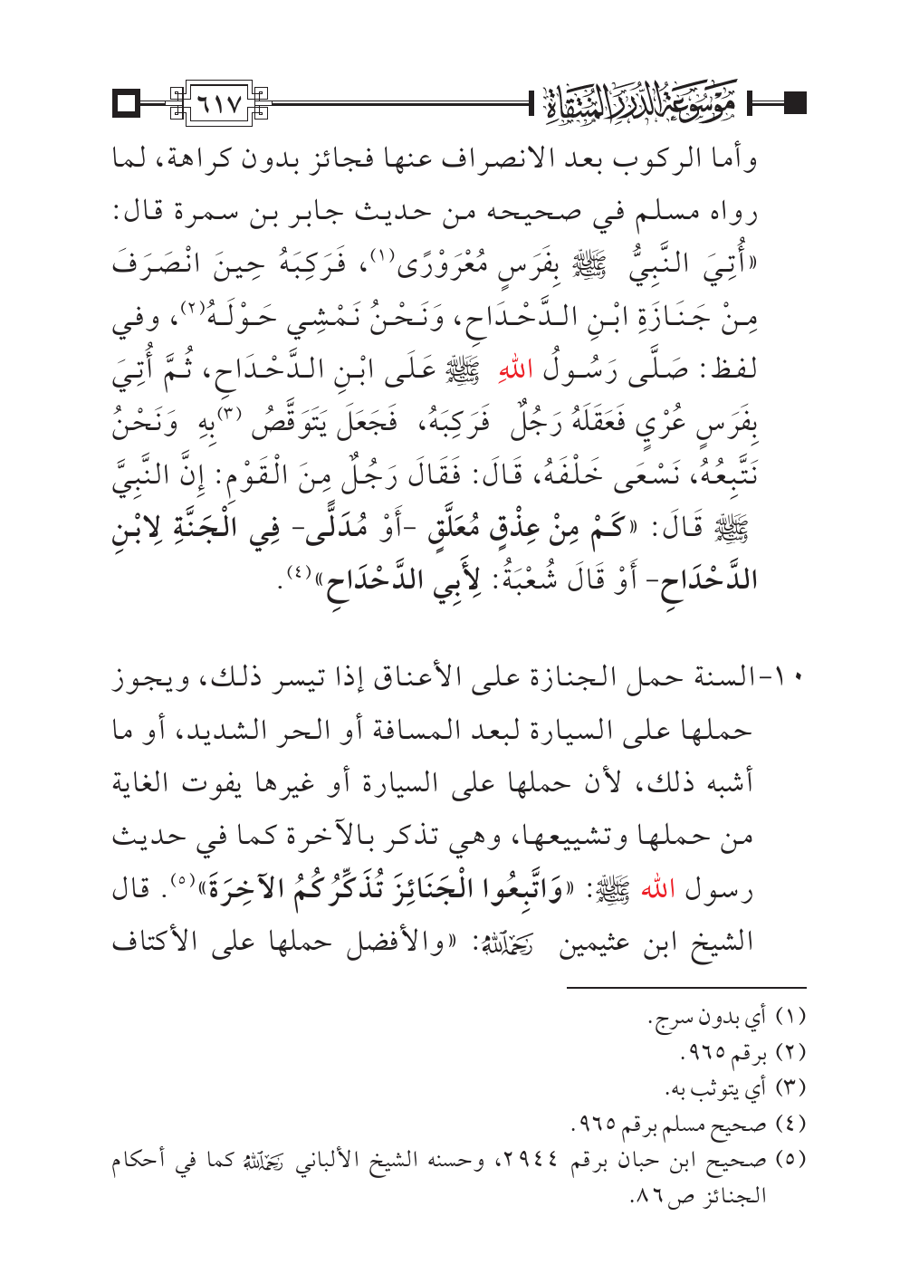 وأما الركوب بعد الانصراف عنها فجائز بدون كراهة، لما رواه مسلم في صحيحه من حديث جابر بن سمرة قال: «أُتِيَ النَّبِيُّ - صلى الله عليه وسلم - بِفَرَسٍ مُعْرَوْرًى (¬١)، فَرَكِبَهُ حِينَ انْصَرَفَ مِنْ جَنَازَةِ ابْنِ الدَّحْدَاحِ، وَنَحْنُ نَمْشِي حَوْلَهُ (¬٢)، وفي لفظ: صَلَّى رَسُولُ اللهِ - صلى الله عليه وسلم - عَلَى ابْنِ الدَّحْدَاحِ، ثُمَّ أُتِيَ بِفَرَسٍ عُرْيٍ فَعَقَلَهُ رَجُلٌ فَرَكِبَهُ، فَجَعَلَ يَتَوَقَّصُ (¬٣) بِهِ وَنَحْنُ نَتَّبِعُهُ، نَسْعَى خَلْفَهُ، قَالَ: فَقَالَ رَجُلٌ مِنَ الْقَوْمِ: إِنَّ النَّبِيَّ - صلى الله عليه وسلم - قَالَ: «كَمْ مِنْ عِذْقٍ مُعَلَّقٍ -أَوْ مُدَلًّى- فِي الْجَنَّةِ لِابْنِ الدَّحْدَاحِ- أَوْ قَالَ شُعْبَةُ: لِأَبِي الدَّحْدَاحِ» (¬٤).