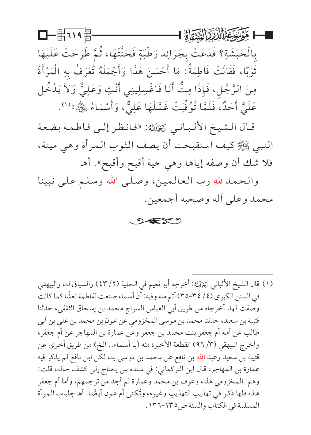 (¬١) قال الشيخ الألباني - رحمه الله -: أخرجه أبو نعيم في الحلية (٢/ ٤٣) والسياق له، والبيهقي في السنن الكبرى (٤/ ٣٤ - ٣٥) أتم منه وفيه: أن أسماء صنعت لفاطمة نعشًا كما كانت وصفت لها. أخرجاه من طريق أبي العباس السراج محمد بن إسحاق الثقفي، حدثنا قتيبة بن سعيد، حدثنا محمد بن موسى المخزومي عن عون بن محمد بن علي بن أبي طالب عن أمه أم جعفر بنت محمد بن جعفر وعن عمارة بن المهاجر عن أم جعفر، وأخرج البيهقي (٣/ ٩٦) القطعة الأخيرة منه (يا أسماء .. الخ) من طريق أخرى عن قتيبة بن سعيد وعبد الله بن نافع عن محمد بن موسى به، لكن ابن نافع لم يذكر فيه عمارة بن المهاجر، قال ابن التركماني: في سنده من يحتاج إلى كشف حاله، قلت: وهم: المخزومي هذا، وعوف بن محمد وعمارة لم أجد من ترجمهم، وأما أم جعفر هذه فلها ذكر في تهذيب التهذيب وغيره، وتُكنى أم عون أيضًا. أهـ جلباب المرأة المسلمة في الكتاب والسنة ص ١٣٥ - ١٣٦.