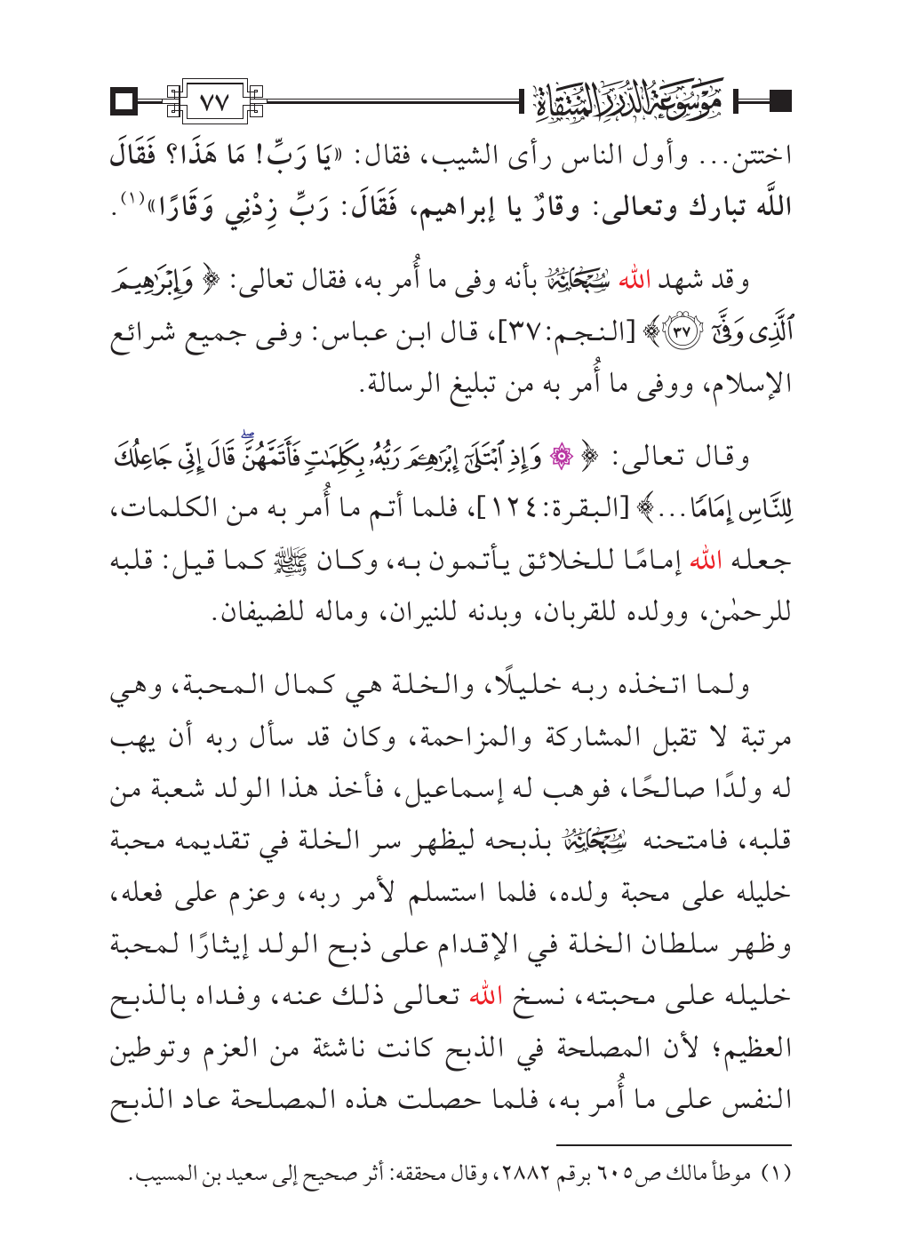 وقال تعالى: {وَإِذِ ابْتَلَى إِبْرَاهِيمَ رَبُّهُ بِكَلِمَاتٍ فَأَتَمَّهُنَّ قَالَ إِنِّي جَاعِلُكَ لِلنَّاسِ إِمَامًا ... } [البقرة:١٢٤]، فلما أتم ما أُمر به من الكلمات، جعله الله إمامًا للخلائق يأتمون به، وكان - صلى الله عليه وسلم - كما قيل: قلبه للرحمن، وولده للقربان، وبدنه للنيران، وماله للضيفان.