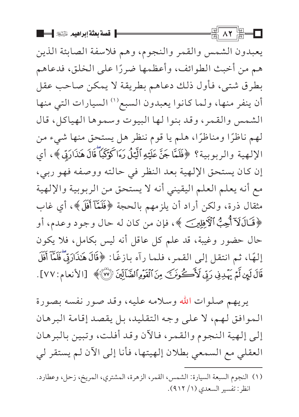 السيارات التي منها الشمس والقمر، وقد بنوا لها البيوت وسموها الهياكل، قال لهم ناظرًا ومناظرًا، هلم يا قوم ننظر هل يستحق منها شيء من الإلهية والربوبية؟ {فَلَمَّا جَنَّ عَلَيْهِ اللَّيْلُ رَأَى كَوْكَبًا قَالَ هَذَا رَبِّي}، أي إن كان يستحق الإلهية بعد النظر في حالته ووصفه فهو ربي، مع أنه يعلم العلم اليقيني أنه لا يستحق من الربوبية والإلهية مثقال ذرة، ولكن أراد أن يلزمهم بالحجة {فَلَمَّا أَفَلَ}، أي غاب {قَالَ لَا أُحِبُّ الْآفِلِينَ}، فإن من كان له حال وجود وعدم، أو حال حضور وغيبة، قد علم كل عاقل أنه ليس بكامل، فلا يكون إلهًا، ثم انتقل إلى القمر، فلما رآه بازغًا: {قَالَ هَذَا رَبِّي فَلَمَّا أَفَلَ قَالَ لَئِنْ لَمْ يَهْدِنِي رَبِّي لَأَكُونَنَّ مِنَ الْقَوْمِ الضَّالِّينَ (٧٧)} [الأنعام:٧٧].