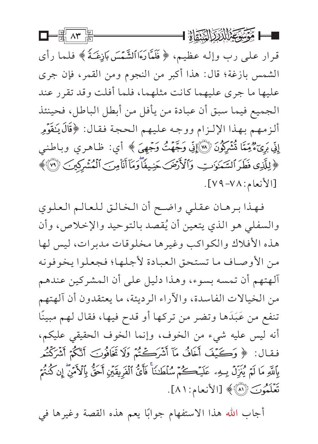 قرار على رب وإله عظيم، {فَلَمَّا الشَّمْسَ} فلما رأى الشمس بازغة؛ قال: هذا أكبر من النجوم ومن القمر، فإن جرى عليها ما جرى عليهما كانت مثلهما، فلما أفلت وقد تقرر عند الجميع فيما سبق أن عبادة من يأفل من أبطل الباطل، فحينئذ ألزمهم بهذا الإلزام ووجه عليهم الحجة فقال: {قَالَ يَاقَوْمِ إِنِّي بَرِيءٌ مِمَّا تُشْرِكُونَ (٧٨) إِنِّي وَجَّهْتُ وَجْهِيَ} أي: ظاهري وباطني {لِلَّذِي فَطَرَ السَّمَاوَاتِ وَالْأَرْضَ حَنِيفًا وَمَا أَنَا مِنَ الْمُشْرِكِينَ (٧٩)} [الأنعام:٧٨ - ٧٩].