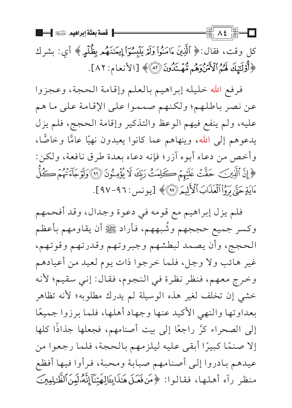 فلم يزل إبراهيم مع قومه في دعوة وجدال، وقد أفحمهم وكسر جميع حججهم وشُبههم، فأراد - صلى الله عليه وسلم - أن يقاومهم بأعظم الحجج، وأن يصمد لبطشهم وجبروتهم وقدرتهم وقوتهم، غير هائب ولا وجل، فلما خرجوا ذات يوم لعيد من أعيادهم وخرج معهم، فنظر نظرة في النجوم، فقال: إني سقيم؛ لأنه خشي إن تخلف لغير هذه الوسيلة لم يدرك مطلوبه؛ لأنه تظاهر بعداوتها والنهي الأكيد عنها وجهاد أهلها، فلما برزوا جميعًا إلى الصحراء كرَّ راجعًا إلى بيت أصنامهم، فجعلها جذاذًا كلها إلا صنمًا كبيرًا أبقى عليه ليلزمهم بالحجة، فلما رجعوا من عيدهم بادروا إلى أصنامهم صبابة ومحبة، فرأوا فيها أفظع منظر رآه أهلها، فقالوا: {مَنْ فَعَلَ هَذَا بِآلِهَتِنَا إِنَّهُ لَمِنَ الظَّالِمِينَ
