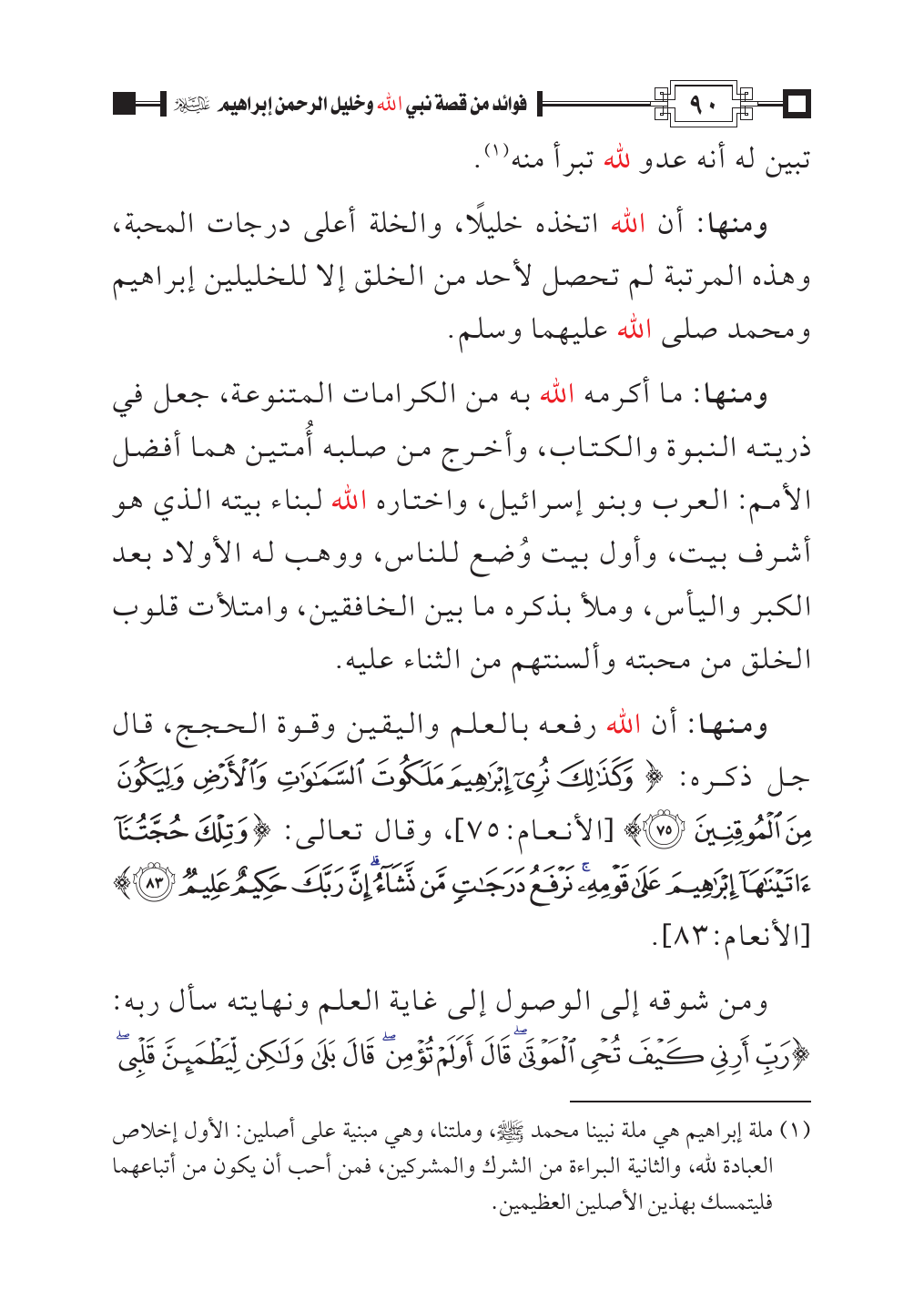(¬١) ملة إبراهيم هي ملة نبينا محمد - صلى الله عليه وسلم -، وملتنا، وهي مبنية على أصلين: الأول إخلاص العبادة لله، والثانية البراءة من الشرك والمشركين، فمن أحب أن يكون من أتباعهما فليتمسك بهذين الأصلين العظيمين.