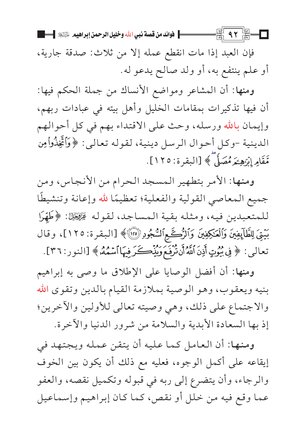 ومنها: أن المشاعر ومواضع الأنساك من جملة الحكم فيها: أن فيها تذكيرات بمقامات الخليل وأهل بيته في عبادات ربهم، وإيمان بالله ورسله، وحث على الاقتداء بهم في كل أحوالهم الدينية -وكل أحوال الرسل دينية، لقوله تعالى: {وَاتَّخِذُوا مِنْ مَقَامِ إِبْرَاهِيمَ مُصَلًّى} [البقرة:١٢٥].