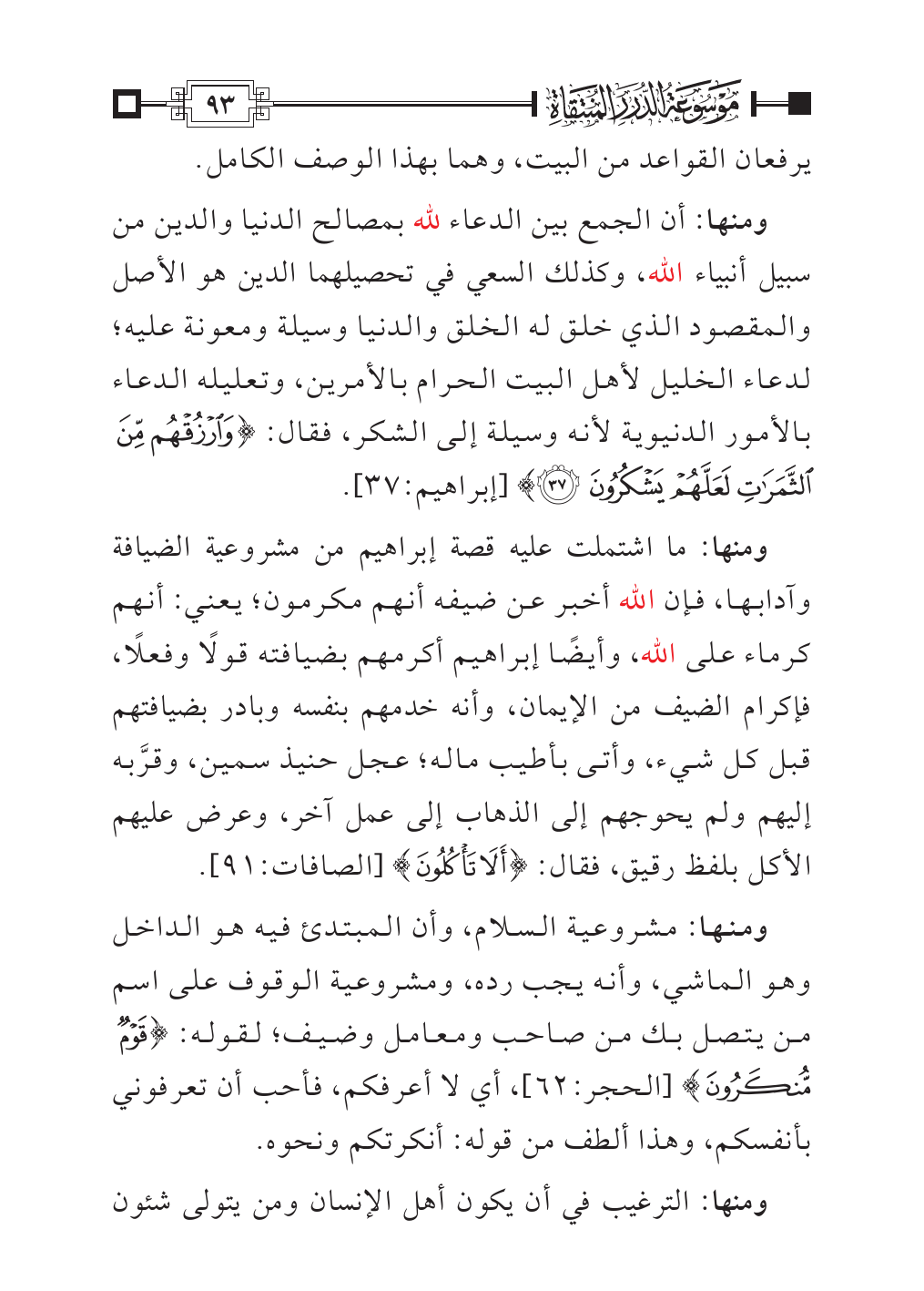 ومنها: ما اشتملت عليه قصة إبراهيم من مشروعية الضيافة وآدابها، فإن الله أخبر عن ضيفه أنهم مكرمون؛ يعني: أنهم كرماء على الله، وأيضًا إبراهيم أكرمهم بضيافته قولًا وفعلًا، فإكرام الضيف من الإيمان، وأنه خدمهم بنفسه وبادر بضيافتهم قبل كل شيء، وأتى بأطيب ماله؛ عجل حنيذ سمين، وقرَّبه إليهم ولم يحوجهم إلى الذهاب إلى عمل آخر، وعرض عليهم الأكل بلفظ رقيق، فقال: {أَلَا تَأْكُلُونَ} [الصافات:٩١].