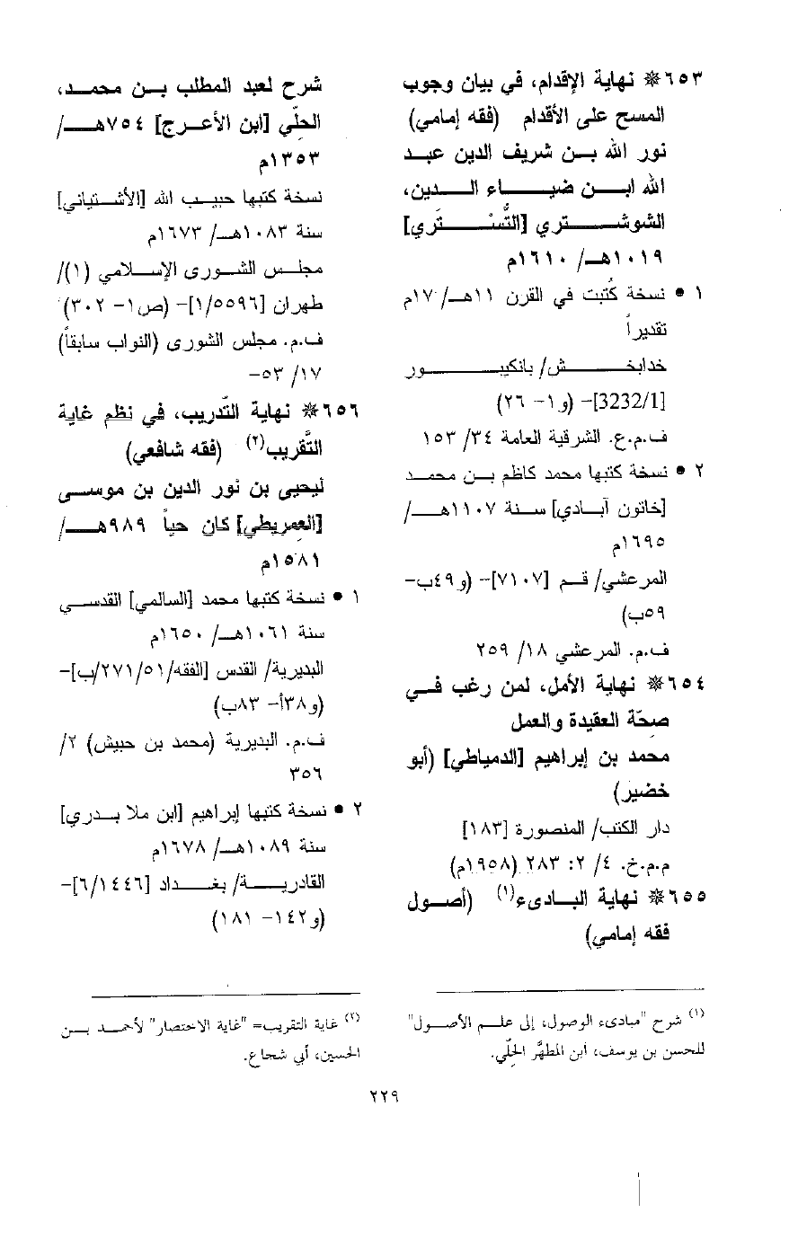 (2) مختصر شرائع الإسلام= "النافع، في مختصر الشرائع" لجعفر بن الحسن، المحقق الحِلّي. وللشرح عنوان آخر هو: "غاية المرام" وردت منه ثمان نسخ في الجزء السادس من "فهرس الفقه وأصوله" (ص408).