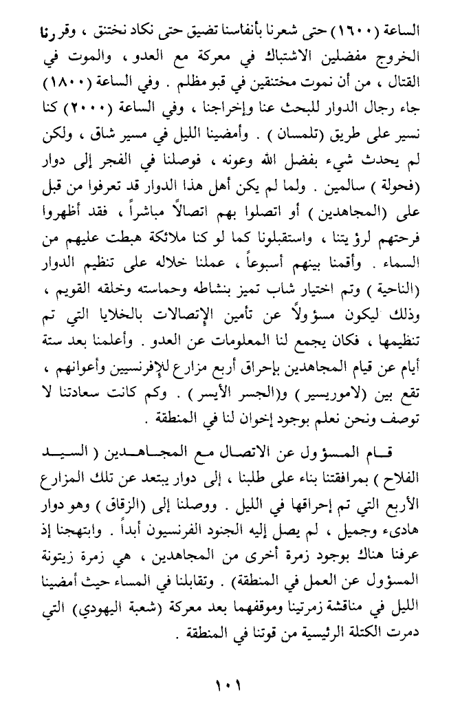 الساعة (1600) حتى شعرنا بأنفاسنا تضيق حتى نكاد نختنق، وقررنا الخروج مفضلين الاشتباك في معركة مع العدو، والموت في القتال، من أن نموت مختنقين في قبو مظلم. وفي الساعة (1800) جاء رجال الدوار للبحث عنا وإخراجنا، وفي الساعة (2000) كنا نسير على طريق (تلمسان) وأمضينا الليل في مسير شاق، ولكن لم يحدث شيء بفضل الله وعونه، فوصلنا في الفجر إلى دوار (فحولة) سالمين. ولما لم يكن أهل هذا الدوار قد تعرفوا من قبل على (المجاهدين) أو اتصلوا بهم اتصالا مباشرا، فقد أظهروا فرحتهم لرؤيتنا، واستقبلونا كما لو كنا ملائكة هبطت عليهم من السماء. وأقمنا بينهم أسبوعا، عملنا خلاله على تنظيم الدوار (الناحية) وتم اختيار شاب تميز بنشاطه وحماسته وخلقه القويم، وذلك ليكون مسؤولا عن تأمين الإتصالات بالخلايا التي تم تنظيمها، فكان يجمع لنا المعلومات عن العدو. وأعلمنا بعد ستة أيام عن قيام المجاهدين بإحراق أربع مزارع للإفرنسيين وأعوانهم، تقع بين (لامور يسير) و (الجسر الأيسر). وكم كانت سعادتنا لا توصف ونحن نعلم بوجود إخوان لنا في المنطقة.