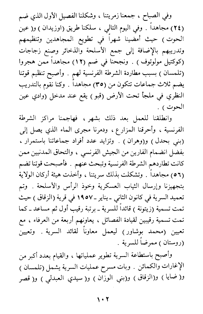 وفي الصباح، جمعنا زمريتنا، وشكلنا الفصيل الأول الذي ضم (24) مجاهدا. وفي اليوم التالي، سلكنا طريق (اوزيدان) و (عين الحوت) حيث أمضينا شهرا في تطويع المجاهدين وتنظيمهم وتدريبهم بالإضافة إلى جمع الأسلحة والذخائر وصنع زجاجات (كوكتيل مولوتوف). ونجحنا في ضم (12) مجاهدا ممن هجروا (تلمسان) بسبب مطاردة الشرطة الفرنسية لهم. وأصبح تنظيم قوتنا يضم ثلاث جماعات تتكون من (35) مجاهدا. وكنا نقوم بالتدريب النظري في ملجأ تحت الأرض (قبو) يقع عند مدخل (وادي عين الحوت).