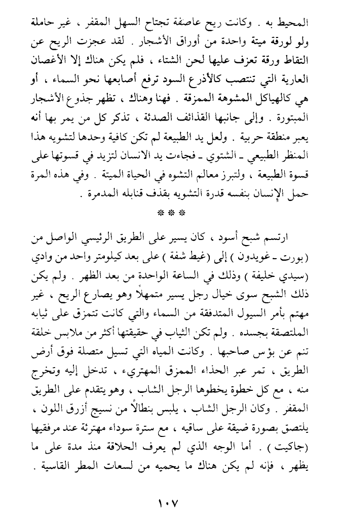 ارتسم شبح أسود، كان يسير على الطريق الرئيسي الواصل من (بورت - غويدون) إلى (غيط شفة) على بعد كيلومتر واحد من وادي (سيدي خليفة) وذلك في الساعة الواحدة من بعد الظهر. ولم يكن ذلك الشبح سوى خيال رجل يسير متمهلا وهو يصارع الريح، غير مهتم بأمر السيول المتدفقة من السماء والتي كانت تتمزق على ثيابه الملتصقة بجسده. ولم تكن الثياب في حقيقتها أكثر من ملابس خلقة تنم عن بؤس صاحبها. وكانت المياه التي تسيل متصلة فوق أرض الطريق، تمر عبر الحذاء الممزق المهتريء، تدخل إليه وتخرج منه، مع كل خطوة يخطوها الرجل الشاب، وهو يتقدم على الطريق المقفر. وكان الرجل الشاب، يلبس بنطالا من نسيج أزرق اللون، يلتصق بصورة ضيقة على ساقيه، مع سترة سوداء مهترئة عند مرفقيها (جاكيت). أما الوجه الذي لم يعرف الحلاقة منذ مدة على ما يظهر، فإنه لم يكن هناك ما يحميه من لسعات المطر القاسية. المحيط به. وكانت ريح عاصفة تجتاح السهل المقفر، غير حاملة ولو لورقة ميتة واحدة من أوراق الأشجار. لقد عجزت الريح عن التقاط ورقة تعزف عليها لحن الشتاء، فلم يكن هناك إلا الأغصان العارية التي تنتصب كالأذرع السود ترفع أصابعها نحو السماء، أو هي كالهياكل المشوهة الممزقة. فهنا وهناك، تظهر جذوع الأشجار المبتورة. وإلى جانبها القذائف الصدئة، تذكر كل من يمر بها أنه يعبر منطقة حربية. ولعل يد الطبيعة لم تكن كافية وحدها لتشويه هذا المنظر الطبيعي - الشتوي - فجاءت يد الانسان لتزيد في قسوتها على قسوة الطبيعة، ولتبرز معالم التشوه في الحياة الميتة. وفي هذه المرة حمل الإنسان بنفسه قدرة التشويه بقذف قنابله المدمرة.