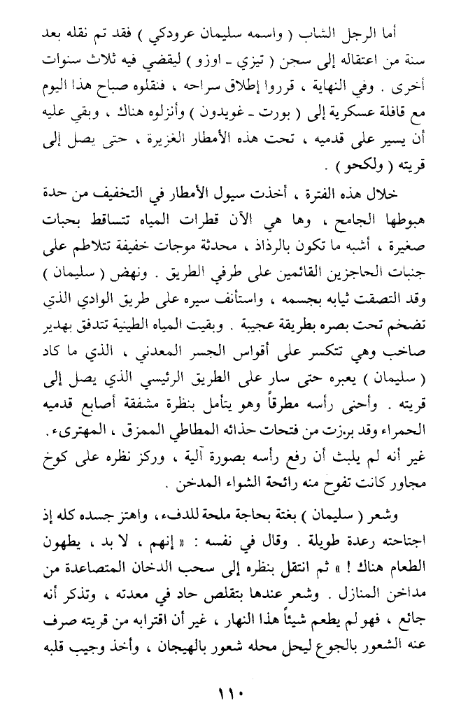 أما الرجل الشاب (واسمه سليمان عرودكي) فقد تم نقله بعد سنة من اعتقاله إلى سجن (تيزي - اوزو) ليقضي فيه ثلاث سنوات أخرى. وفي النهاية، قرروا إطلاق سراحه، فنقلوه صباح هذا اليوم مع قافلة عسكرية إلى (بورت - غويدون) وأنزلوه هناك، وبقي عليه أن يسير على قدميه، تحت هذه الأمطار الغزيرة، حتى يصل إلى قريته (ولكحو).
