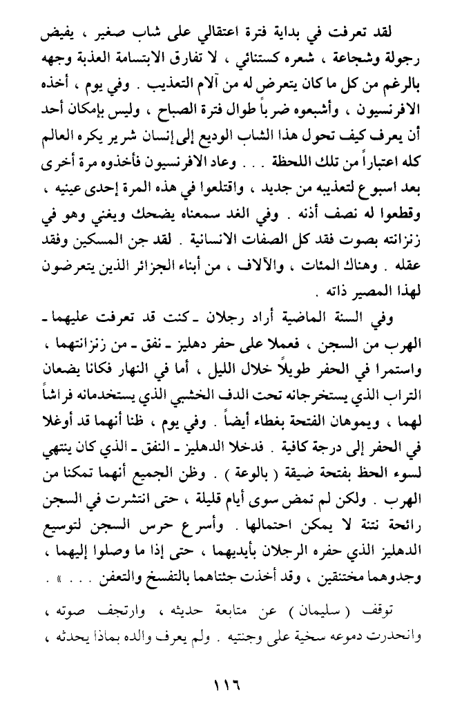 لقد تعرفت في بداية فترة اعتقالي على شاب صغير، يفيض رجولة وشجاعة، شعره كستنائي، لا تفارق الابتسامة العذبة وجهه بالرغم من كل ما كان يتعرض له من آلام التعذيب. وفي يوم، أخذه الافرنسيون، وأشبعوه ضربا طوال فترة الصباح، وليس بإمكان أحد أن يعرف كيف تحول هذا الشاب الوديع إلى إنسان شرير يكره العالم كله اعتبارا من تلك اللحظة ... وعاد الافرنسيون فأخذوه مرة أخرى بعد أسبوع لتعذيبه من جديد، واقتلعوا في هذه المرة إحدى عينيه، وقطعوا له نصف أذنه. وفي الغد سمعناه يضحك ويغني وهو في زنزانته بصوت فقد كل الصفات الانسانية. لقد جن المسكين وفقد عقله. وهناك المئات، والآلاف، من أبناء الجزائر الذين يتعرضون لهذا المصير ذاته.