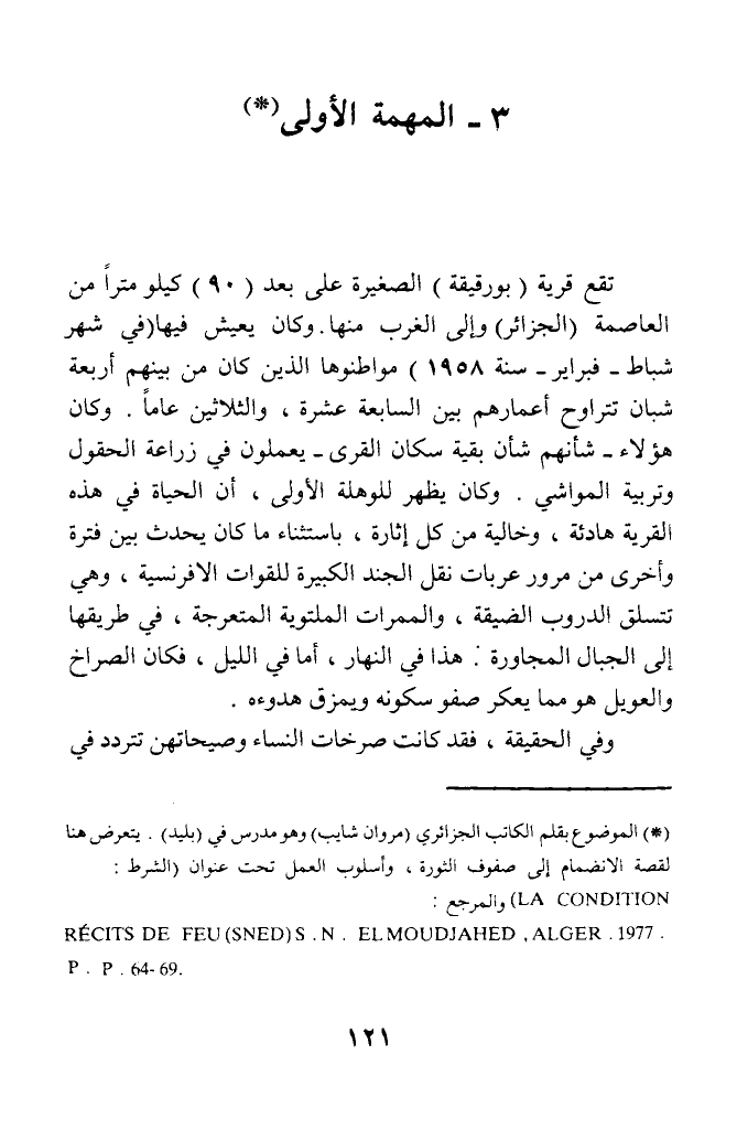 (*) الموضوع بقلم الكاتب الجزائري (مروان شايب) وهو مدرس في (بليد). يتعرض هنا لقصة الانضمام إلى صفوف الثورة، وأسلوب العمل تحت عنوان (الشرط: LA CONDITION) والمرجع: