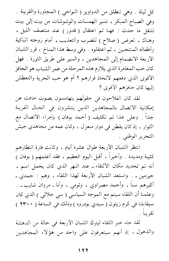 انتظر الشبان الأربعة طوال عشرة أيام، وكانت فترة انتظارهم كئيبة ومديدة. وأخيرا، أقبل اليوم العظيم، فقد أعلمهم (بوفان) أنه تم تحديد مكان الالتقاء - عند النهر الذي كان يحمل اسم، جيرمين -. واستعد الشبان الأربعة لهذا اللقاء، وهم حمدي - أكبرهم سنا، وأحمد مصراوي، وتومي، وأنا - مروان شايب -. وعلمنا أن اللقاء سيتم مع الموجه السياسي (سي جلالي) الذي كان سيقابلنا في كرم زيتون (سيدي بودروه) وذلك في الساعة (2300) تقريبا.