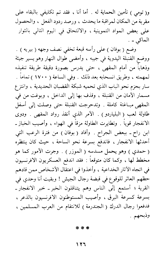ووضع القنبلة اليدوية في جيبه، وأمضى طوال النهار وهو يسير جيئة وذهابا من أمام المقهى، حتى يدرس بصورة دقيقة طريقة تنفيذه لمهمته، وطريق انسحابه بعد ذلك. وفي الساعة (1700) تماما. سار بحزم نحو الباب الذي تحميه شبكة القضبان الحديدية، وانتزع مسمار الأمان من القنبلة، وقذف بها إلى الداخل، وبوغت من في المقهى مباغتة كاملة. وتدحرجت القنبلة حتى وصلت إلى أسفل طاولة لعب (البلياردو). الأمر الذي أنقذ رواد المقهى ودوى الانفجار قويا. وتطايرت الطاولة مزقا في الهواء، وأصيب الخباز - ابن راح - ببعض الجراح. وأفاد (بوفان) من فترة الرعب التي أحدثها الانفجار، فاندفع بسرعة نحو الساحة، حيث كان ينتظره (حمدي) وهو يحمل مسدسه (الموزر). وجرت الأمور كما هو مخطط لها، وكما كان متوقعا فقد اندفع العسكريون الافرنسيون في اتجاه الآثار الخداعية، وأخذوا في اعتقال الأشخاص ممن قادهم حظهم العاثر للوقوع في قبضة رجال الجيش! وبقيت أنا وحدي في القرية؛ أستمع إلى الناس وهم يتناقلون الخبر - خبر الانفجار - بسرعة كسرعة البرق، وأصيب المستوطنون الافرسيون بالذعر، فدفعوا رجال الدرك (الجندرمة) للانتقام من العرب المسلمين، وذبحهم.