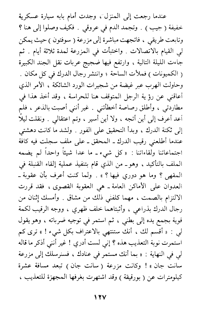 وتابعت طريقي، فاتجهت مباشرة إلى مزرعة (سوفتون) حيث يمكن لي القيام بالاتصالات. واختبأت في المزرعة لمدة ثلاثة أيام. ثم جاءت الليلة التالية، وارتفع فيها ضجيج عربات نقل الجند الكبيرة (الكميونات) فملأت الساحة؛ وانتشر رجال الدرك في كل مكان. وحاولت الهرب عبر غيضة من شجيرات الورد الشائكة، الأمر الذي أعاقني عن رؤية الرجل المتوقف هنا للحراسة، وقد أخذ هذا في مطاردتي، وأطلق رصاصة أخطأتني. غير أنني أصبت بالذعر، فلم أعد أعرف إلى أين أتجه، ولا أين أسير، وتم اعتقالي. ونقلت ليلا إلى ثكنة الدرك، وبدأ التحقيق على الفور. ولشد ما كانت دهشتي عندما أطلعني رقيب الدرك - المحقق - على ملف سجلت فيه كافة اجتماعاتنا ولقاءاتنا: (كل شيء - ما عدا شيئا واحدا لم يضمه الملف بالتأكيد، وهو - من الذي قام بتنفيذ عملية إلقاء القنبلة في المقهى؟ وما هو دوري فيها؟) ولما كنت أعرف بأن عقوبة - العدوان على الأماكن العامة - هي العقوبة القصوى، فقد قررت الالتزام بالصمت، مهما كلفني ذلك من مشاق. وأمسك إثنان من رجال الدرك بذراعي، وأثبتاهما خلف ظهري، ووجه الرقيب لكمة قوية بجمع يده إلى بطني، ثم استمر في توجيه ضرباته، وهو يقول لي (أقسم لك، أنك ستنتهي بالاعتراف بكل شيء!) ترى كم استمرت نوبة التعذيب هذه؟ إني لست أدري! غير أنني أذكر ما قاله لي في النهاية: (بما أنك مستمر في عنادك، فسنرسلك إلى مزرعة سانت جان)! وكانت مزرعة (سانت جان) تبعد مسافة عشرة كيلومترات عن (بورقيقة) وقد اشتهرت بغرفها المجهزة للتعذيب،