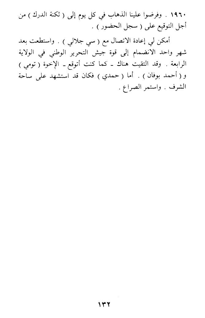 أمكن لي إعادة الاتصال مع (سي جلالي). واستطعت بعد شهر واحد الانضمام إلى قوة جيش التحرير الوطني في الولاية الرابعة وقد التقيت هناك - كما كنت أتوقع - الإخوة (تومي) و (أحمد بوفان). أما (حمدي) فكان قد استشهد على ساحة الشرف. واستمر الصراع.