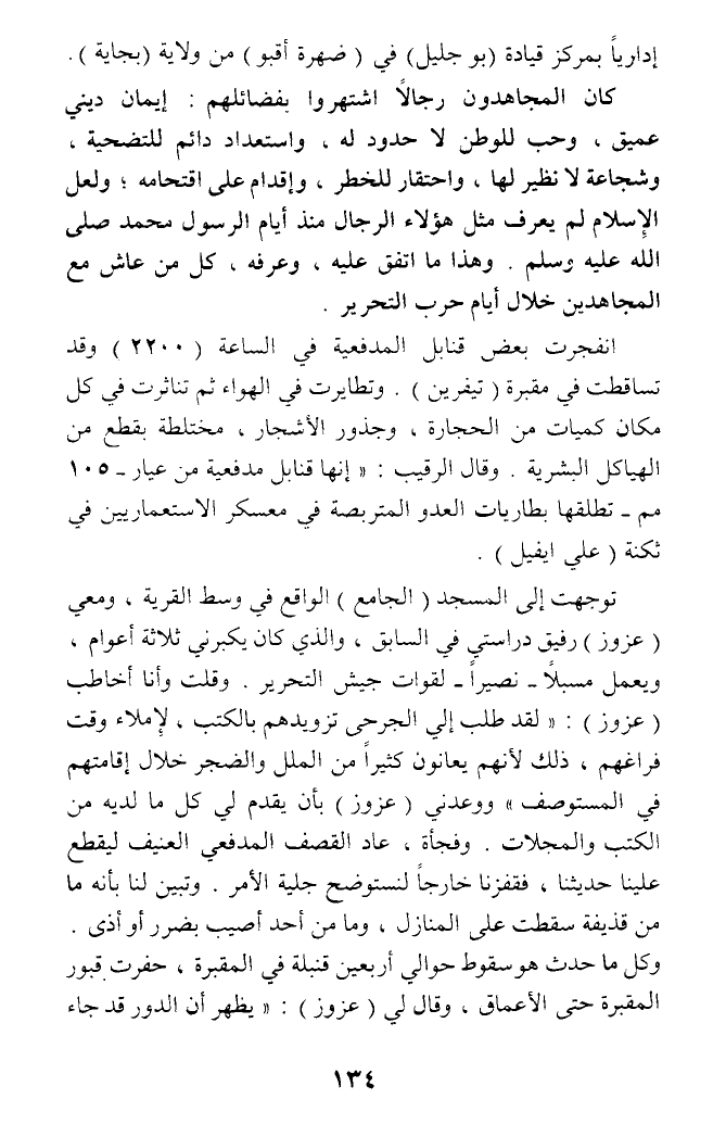 انفجرت بعض قنابل المدفعية في الساعة (2200) وقد تساقطت في مقبرة (تيفرين). وتطايرت في الهواء ثم تناثرت في كل مكان كميات من الحجارة، وجذور الأشجار، مختلطة بقطع من الهياكل البشرية. وقال الرقيب: (إنها قنابل مدفعية من عيار - 105 مم - تطلقها بطاريات العدو المتربصة في معسكر الاستعماريين في ثكنة (علي ايفيل).