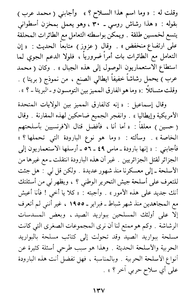 وقلت له: (وما اسم هذا السلاح؟) وأجابني (محمد عرب) بقوله: (هذا رشاش روسي - 30، وهو يعمل بمخزن أسطواني يتسع لخمسين طلقة. ويمكن بواسطته التعامل مع الطائرات المحلقة على ارتفاع منخفض). وقال (عزوز) متابعا الحديث: (إن التعامل مع الطائرات بات أمرا ضروريا، فلولا الدعم الجوي لما استطاع الاستعماريون الوصول إلى هذه الجبال). وكان (محمد عرب) يحمل رشاشا خفيفا إيطالي الصنع، من نموذج (بريتا). وقلت متسائلا: (وما هو الفارق المميز بين التومسون و - البريتا -؟).