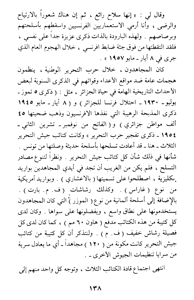 وقال لي: (إنها سلاح رائع، ثم إن هناك شعورا بالارتياح والرضى، وأنا أرمي الاستعماريين الفرنسيين واسقطهم بأسلحتهم وبرصاصهم. ولهذه البارودة بالذات ذكرى عزيزة جدا على نفسي، فلقد التقطتها من فوق جثة ضابط افرنسي، خلال الهجوم العام الذي جرى في 8 أيار - مايو 1957).
