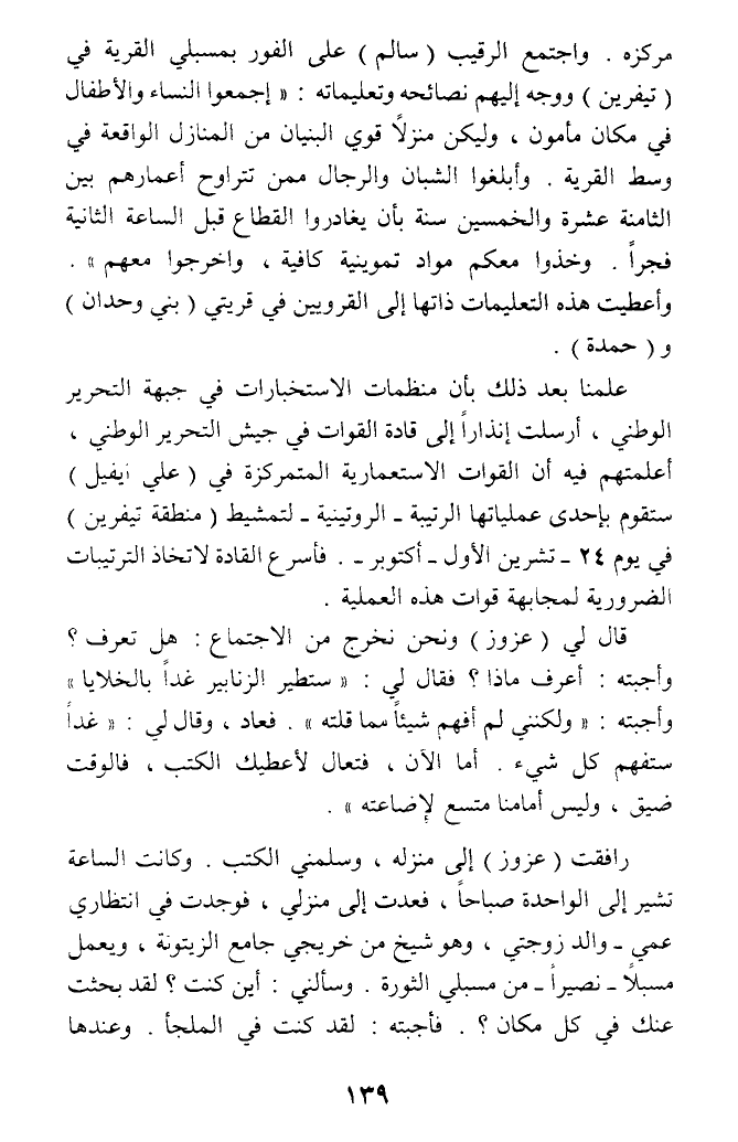 علمنا بعد ذلك بأن منظمات الاستخبارات في جبهة التحرير الوطني، أرسلت إنذارا إلى قادة القوات في جيش التحرير الوطني، أعلمتهم فيه أن القوات الاستعمارية المتمركزة في (علي أيفيل) ستقوم بإحدى عملياتها الرتيبة - الروتينية - لتمشيط (منطقة تيفرين) في يوم 24 - تشرين الأول - أكتوبر -. فأسرع القادة لاتخاذ الترتيبات الضرورية لمجابهة قوات هذه العملية.