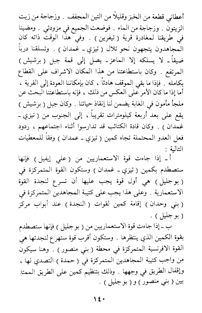 أعطاني قطعة من الخبز وقليلا من التين المجفف. وزجاجة من زيت الزيتون. وزجاجة من الماء فوضعت الجميع في مزودتي. ومضينا في طريقنا لمغادرة قرية (تيفرين). وفي هذا الوقت ذاته كان المجاهدون يتجهون نحو تلال (تيزي - غمدان). وتسلقنا دربا ضيقا - لا يسلكه إلا الماعز - يصل إلى قمة جبل (برشيش) المرتفع. وكان باستطاعتنا من هذا المكان الاشراف على القطاع بكامله. فإذا ما بقي الموقف هادئا، كان بإمكاننا العودة إلى القرية، أما إذا ما كان الأمر على العكس من ذلك، فإنه باستطاعتنا البحث عن ملجأ مأمون في الغابة يضمن لنا إنقاذ حياتنا. وكان جبل (برشيش) يقع على بعد أربعة كيلومترات تقريبا، إلى الجنوب من (تيزي - غمدان). وكان قادة الكتائب قد تدارسوا أثناء اجتماعهم، ردود فعل العدو المحتملة تجاه كمين (تيزي - عمدان) وفقا للمعطيات التالية:
