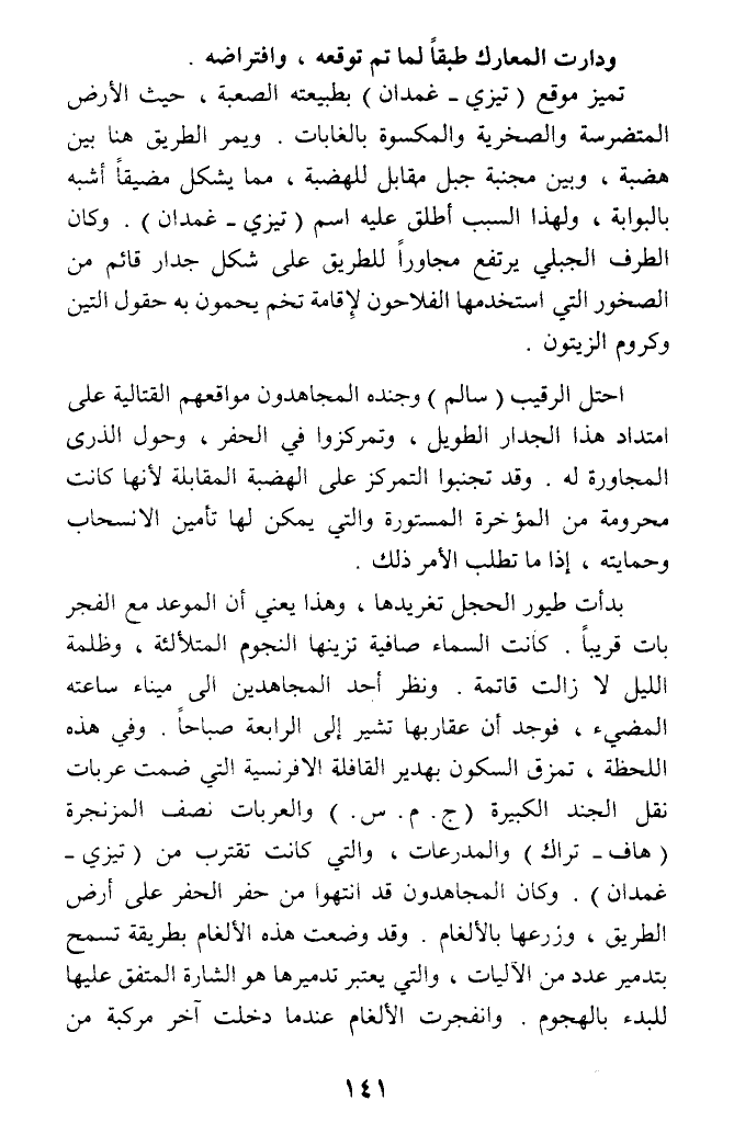 بدأت طيور الحجل تغريدها، وهذا يعني أن الموعد مع الفجر بات قريبا. كانت السماء صافية تزينها النجوم المتلالئة، وظلمة الليل لا زالت قاتمة. ونظر أحد المجاهدين الى ميناء ساعته المضيء، فوجد أن عقاربها تشير إلى الرابعة صباحا. وفي هذه اللحظة، تمزق السكون بهدير القافلة الافرنسية التي ضمت عربات نقل الجند الكبيرة (ج. م. س) والعربات نصف المزنجرة (هاف - تراك) والمدرعات، والتي كانت تقترب من (تيزي - غمدان). وكان المجاهدون قد انتهوا من حفر الحفر على أرض الطريق، وزرعها بالألغام. وقد وضعت هذه الألغمام بطريقة تسمح بتدمير عدد من الآليات، والتي يعتبر تدميرها هو الشارة المتفق عليها للبدء بالهجوم. وانفجرت الألغام عندما دخلت آخر مركبة من