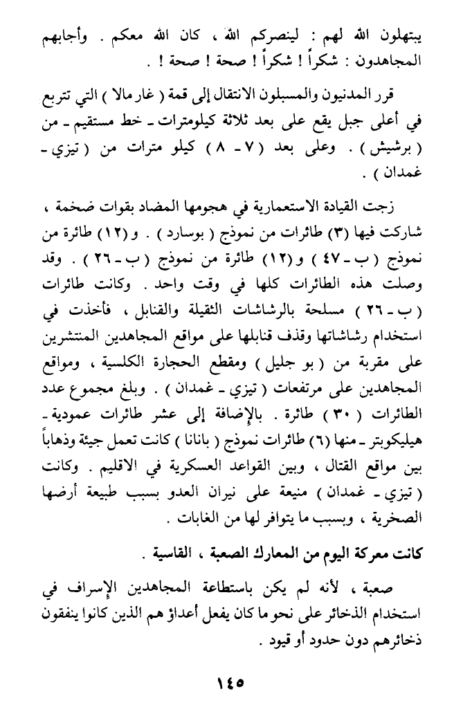 على مقربة من (بو جليل) ومقطع الحجارة الكلسية، ومواقع المجاهدين على مرتفعات (تيزي - غمدان). وبلغ مجموع عدد الطائرات (30) طائرة. بالإضافة إلى عشر طائرات عمودية - هيليكوبتر - منها (6) طائرات نموذج (بانانا) كانت تعمل جيئة وذهابا بين مواقع القتال، وبين القواعد العسكرية في الاقليم. وكانت (تيزي - غمدان) منيعة على نيران العدو بسبب طبيعة أرضها الصخرية، وبسبب ما يتوافر لها من الغابات.