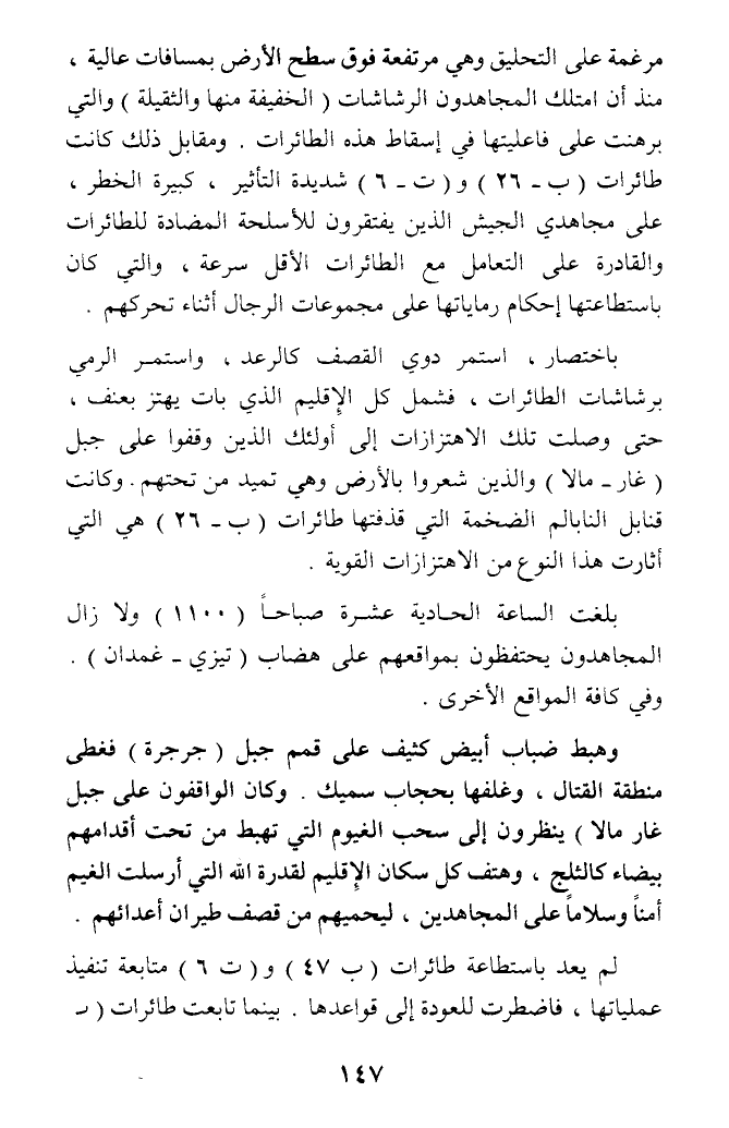 مرغمة على التحليق وهي مرتفعة فوق سطح الأرض بمسافات عالية، منذ أن امتلك المجاهدون الرشاشات (الخفيفة منها والثقيلة) والتي برهنت على فاعليتها في إسقاط هذه الطائرات. ومقابل ذلك كانت طائرات (ب - 26) و (ت - 6) شديدة التأثير، كبيرة الخطر، على مجاهدي الجيش الذين يفتقرون للأسلحة المضادة للطائرات والقادرة على التعامل مع الطائرات الأقل سرعة، والتي كان باستطاعتها إحكام رماياتها على مجموعات الرجال أثناء تحركهم.