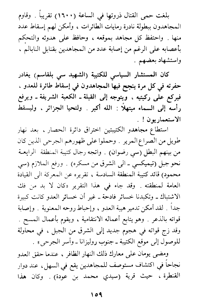 كان المستشار السياسي للكتيبة (الشهيد سي بلقاسم) يغادر حفرته في كل مرة ينجح فيها المجاهدون في إسقاط طائرة للعدو، فيركع على ركبتيه، ويتوجه إلى القبلة - الكعبة الشريفة - ويرفع رأسه إلى السماء مبتهلا: الله أكبر. ولتحيا الجزائر، وليسقط الاستعماريون!.