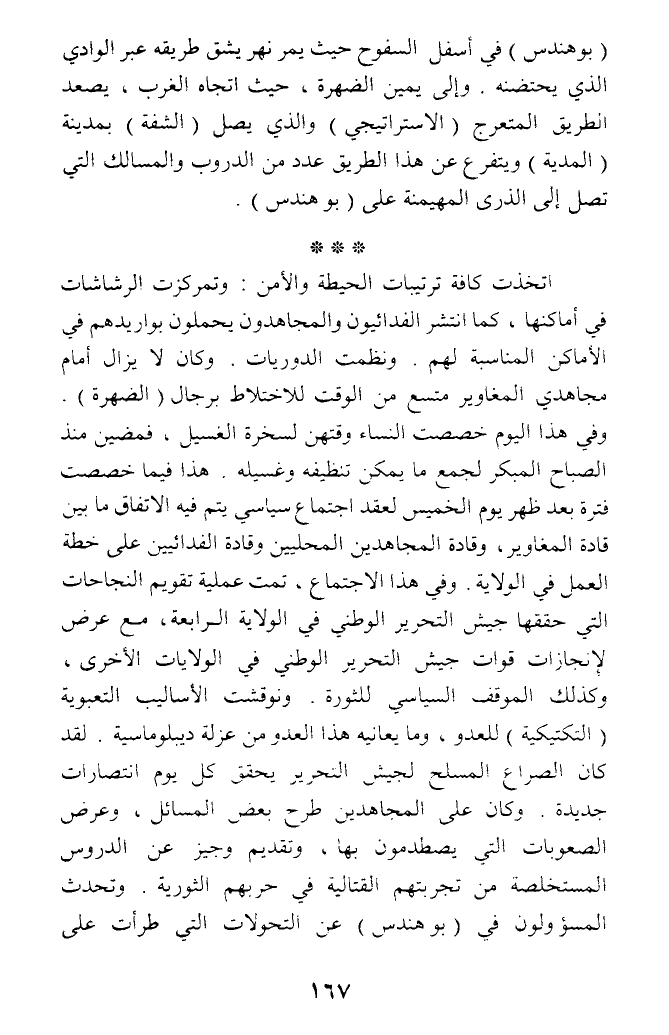 اتخذت كافة ترتيبات الحيطة والأمن: وتمركزت الرشاشات في أماكنها، كما انتشر الفدائيون والمجاهدون يحملون بواريدهم في الأماكن المناسبة لهم. ونظمت الدوريات. وكان لا يزال أمام مجاهدي المغاوير متسع من الوقت للاختلاط برجال (الضهرة). وفي هذا اليوم خصصت النساء وقتهن لسخرة الغسيل، فمضين منذ الصباح المبكر لجمع ما يمكن تنظيفه وغسيله. هذا فيما خصصت فترة بعد ظهر يوم الخميس لعقد اجتماع سياسي يتم فيه الاتفاق ما بين قادة المغاوير، وقادة المجاهدين المحليين وقادة الفدائيين على خطة العمل في الولاية. وفي هذا الاجتماع، تمت عملية تقويم النجاحات التي حققها جيش التحرير الوطني في الولاية الرابعة، مع عرض لإنجازات قوات جيش التحرير الوطني في الولايات الأخرى، وكذلك الموقف السياسي للثورة. ونوقشت الأساليب التعبوية (التكتيكية) للعدو، وما يعانيه هذا العدو من عزلة ديبلوماسية. لقد كان الصراع المسلح لجيش التحرير يحقق كل يوم انتصارات جديدة وكان على المجاهدين طرح بعض المسائل، وعرض الصعوبات التي يصطدمون بها، وتقديم وجيز عن الدروس المستخلصة من تجربتهم القتالية في حربهم الثورية. وتحدث المسؤولون في (بوهندس) عن التحولات التي طرأت على