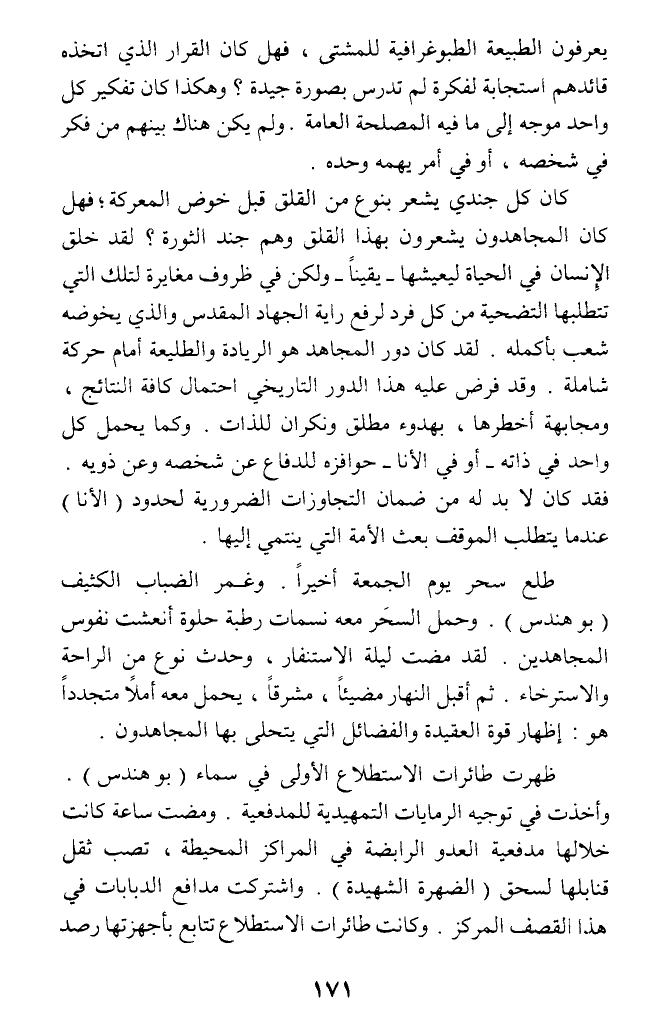 يعرفون الطبيعة الطبوغرافية للمشتى، فهل كان القرار الذي اتخذه قائدهم استجابة لفكرة لم تدرس بصورة جيدة؟ وهكذا كان تفكير كل واحد موجه إلى ما فيه المصلحة العامة. ولم يكن هناك بينهم من فكر في شخصه، أو في أمر يهمه وحده.