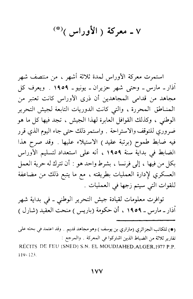 (*) للكاتب الجزائري (مازاري بن يوسف) وهو مجاهد قديم. وقد اعتمد في بحثه على تقارير ثلاثة من الضباط الذين اشركوا في المعركة. والمرجع: