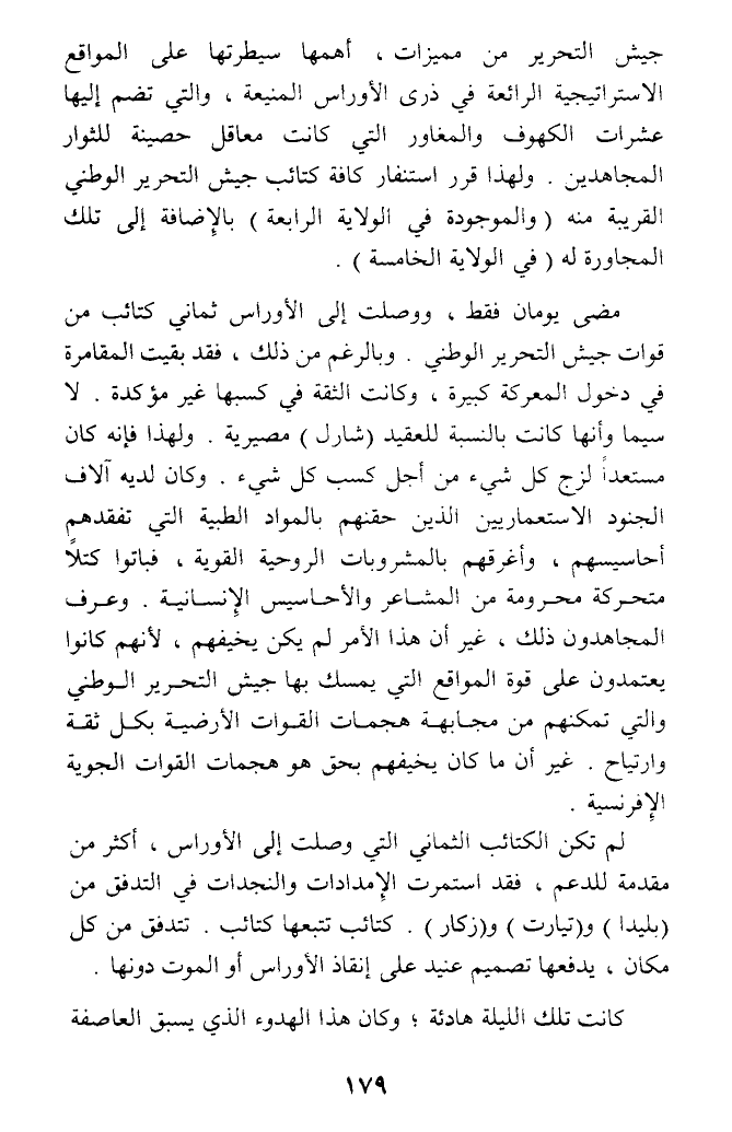مضى يومان فقط، ووصلت إلى الأوراس ثماني كتائب من قوات جيش التحرير الوطني. وبالرغم من ذلك، فقد بقيت المقامرة في دخول المعركة كبيرة، وكانت الثقة في كسبها غير مؤكدة. لا سيما وأنها كانت بالنسبة للعقيد (شارل) مصيرية. ولهذا فإنه كان مستعدا لزج كل شيء من أجل كسب كل شيء. وكان لديه آلاف الجنود الاستعماريين الذين حقنهم بالمواد الطبية التي تفقدهم أحاسيسهم، وأغرقهم بالمشروبات الروحية القوية، فباتوا كتلا متحركة - ومحرومة من المشاعر والأحاسيس الإنسانية. وعرف المجاهدون ذلك، غير أن هذا الأمر لم يكن يخيفهم، لأنهم كانوا يعتمدون على قوة المواقع التي يمسك بها جيش التحرير الوطني والتي تمكنهم من مجابهة هجمات القوات الأرضية بكل ثقة وارتياح غير أن ما كان يخيفهم بحق هو هجمات القوات الجوية الإفرنسية.