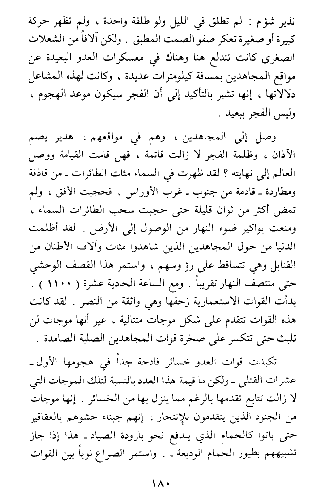 نذير شؤم: لم تطلق في الليل ولو طلقة واحدة، ولم تظهر حركة كبيرة أو صغيرة تعكر صفو الصمت المطبق. ولكن آلافا من الشعلات الصغرى كانت تندلع هنا وهناك في معسكرات العدو البعيدة عن مواقع المجاهدين بمسافة كيلومترات عديدة، وكانت لهذه المشاعل دلالاتها، إنها تشير بالتأكيد إلى أن الفجر سيكون موعد الهجوم، وليس الفجر ببعيد.