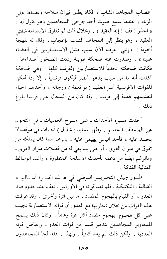 أعصاب المجاهد الشاب، فكاد يطلق نيران سلاحه ويضغط على الزناد، عندما سمع صوت أحد جرحى المجاهدين وهو يقول له (احذر! قف! إنه العقيد). وخلال ذلك لم تفارق الابتسامة شفتي العقيد، وهو ينظر إلى المجاهد الشاب بإعجاب، وقال له بلهجة أخوية: (إنني أعرف الآن سبب فشل الاستعماريين في القضاء علينا). وصدرت عنه ضحكة طويلة رددت الصخور أصداءها. فكانت ضحكته تحديا للاستعماريين ولفرنسا كلها. وهي ضحكة أكدت أنه ما من سبب يدعو النصر ليكون فرنسيا، إلا إذا أمكن للقوات الافرنسية أسر العقيد (بو نعمة) ورجاله، وأخذهم أحياء لتقديمهم هدية إلى فرنسا. وقد كان من المحال على فرنسا بلوغ ذلك.