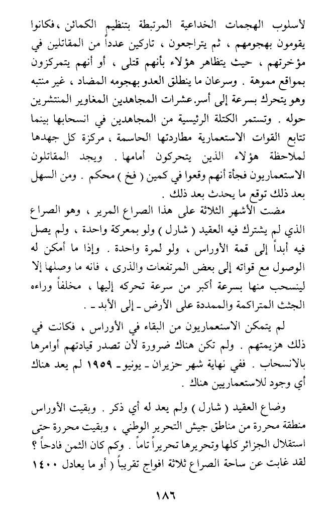 مضت الأشهر الثلاثة على هذا الصراع المرير، وهو الصراع الذي لم يشترك فيه العقيد (شارل) ولو بمعركة واحدة، ولم يصل فيه أبدا إلى قمة الأوراس، ولو لمرة واحدة. وإذا ما أمكن له الوصول مع قواته إلى بعض المرتفعات والذرى، فإنه ما وصلها إلا لينسحب منها بسرعة أكبر من سرعة تحركه إليها، مخلفا وراءه الجثث المتراكمة والممددة على الأرض - إلى الأبد -.