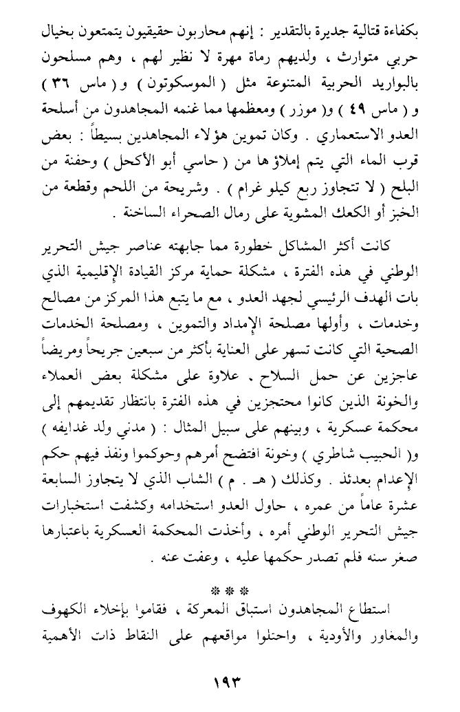 بكفاءة قتالية جديرة بالتقدير: إنهم محاربون حقيقيون يتمتعون بخيال حربي متوارث، ولديهم رماة مهرة لا نظير لهم، وهم مسلحون بالبواريد الحربية المتنوعة مثل (الموسكوتون) و (ماس 36) و (ماس 49) و (موزر) ومعظمها مما غنمه المجاهدون من أسلحة العدو الاستعماري. وكان تموين هؤلاء المجاهدين بسيطا: بعض قرب الماء التي يتم إملاؤها من (حاسي أبو الأكحل) وحفنة من البلح (لا تتجاوز ربع كيلو غرام). وشريحة من اللحم وقطعة من الخبز أو الكعك المشوية على رمال الصحراء الساخنة.