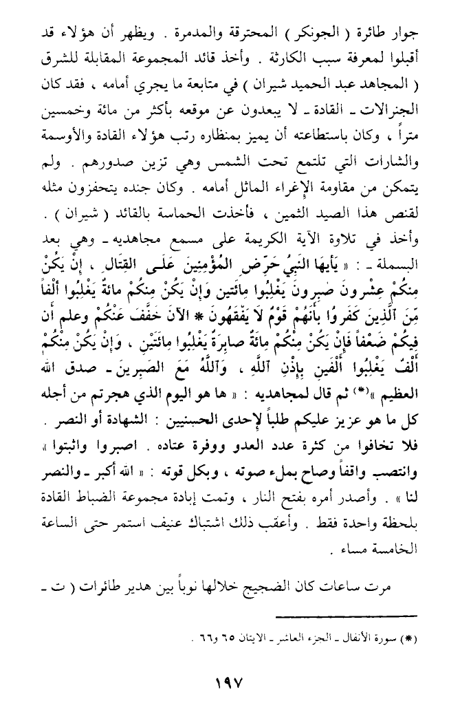 جوار طائرة (الجونكر) المحترقة والمدمرة. ويظهر أن هؤلاء قد أقبلوا لمعرفة سبب الكارثة. وأخذ قائد المجموعة المقابلة للشرق (المجاهد عبد الحميد شيران) في متابعة ما يجري أمامه، فقد كان الجنرالات - القادة - لا يبعدون عن موقعه بأكثر من مائة وخمسين مترا، وكان باستطاعته أن يميز بمنظاره رتب هؤلاء القادة والأوسمة والشارات التي تلتمع تحت الشمس وهي تزين صدورهم. ولم يتمكن من مقاومة الإغراء الماثل أمامه. وكان جنده يتحفزون مثله لقنص هذا الصيد الثمين، فأخذت الحماسة بالقائد (شيران) وأخذ في تلاوة الآية الكريمة على مسمع مجاهديه - وهي بعد البسملة -: {يَاأَيُّهَا النَّبِيُّ حَرِّضِ الْمُؤْمِنِينَ عَلَى الْقِتَالِ إِنْ يَكُنْ مِنْكُمْ عِشْرُونَ صَابِرُونَ يَغْلِبُوا مِائَتَيْنِ وَإِنْ يَكُنْ مِنْكُمْ مِائَةٌ يَغْلِبُوا أَلْفًا مِنَ الَّذِينَ كَفَرُوا بِأَنَّهُمْ قَوْمٌ لَا يَفْقَهُونَ * الْآنَ خَفَّفَ اللَّهُ عَنْكُمْ وَعَلِمَ أَنَّ فِيكُمْ ضَعْفًا فَإِنْ يَكُنْ مِنْكُمْ مِائَةٌ صَابِرَةٌ يَغْلِبُوا مِائَتَيْنِ وَإِنْ يَكُنْ مِنْكُمْ أَلْفٌ يَغْلِبُوا أَلْفَيْنِ بِإِذْنِ اللَّهِ وَاللَّهُ مَعَ الصَّابِرِينَ} - صدق الله العظيم) (*) ثم قال لمجاهديه: (ها هو اليوم الذي هجرتم من أجله كل ما هو عزيز عليكم طلبا لإحدى الحسنيين الشهادة أو النصر فلا تخافوا من كثرة عدد العدو ووفرة عتاده. اصبروا واثبتوا) وانتصب واقفا وصاح بملء صوته، وبكل قوته: (الله أكبر - والنصر لنا). وأصدر أمره بفتح النار، وتمت إبادة مجموعة الضباط القادة بلحظة واحدة فقط. وأعقب ذلك اشتباك عنيف استمر حتى الساعة الخامسة مساء
