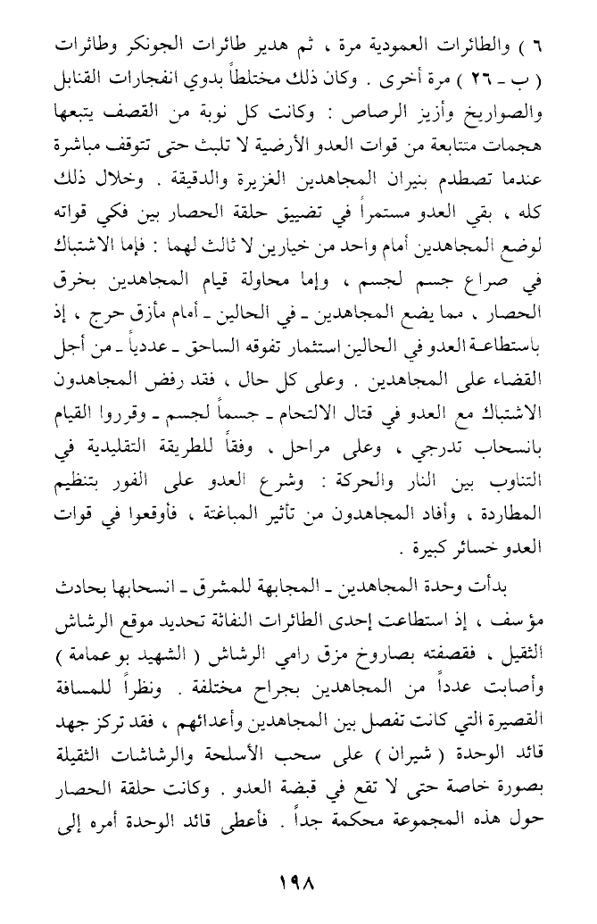 6) والطائرات العمودية مرة، ثم هدير طائرات الجونكر وطائرات (ب - 26) مرة أخرى. وكان ذلك مختلطا بدوي انفجارات القنابل والصواريخ وأزيز الرصاص: وكانت كل نوبة من القصف يتبعها هجمات متتابعة من قوات العدو الأرضية لا تلبث حتى تتوقف مباشرة عندما تصطدم بنيران المجاهدين الغزيرة والدقيقة. وخلال ذلك كله، بقي العدو مستمرا في تضييق حلقة الحصار بين فكي قواته لرضع المجاهدين أمام واحد من خيارين لا ثالث لهما: فإما الاشتباك في صراع جسم لجسم، وإما محاولة قيام المجاهدين بخرق الحصار، مما يضع المجاهدين - في الحالين - أمام مأزق حرج، إذ باستطاعة العدو في الحالين استثمار تفوقه الساحق - عدديا - من أجل القضاء على المجاهدين. وعلى كل حال، فقد رفض المجاهدون الاشتباك مع العدو في قتال الالتحام - جسما لجسم - وقرروا القيام بانسحاب تدرجي، وعلى مراحل، وفقا للطريقة التقليدية في التناوب بين النار والحركة: وشرع العدو على الفور بتنظيم المطاردة، وأفاد المجاهدون من تأثير المباغتة، فأوقعوا في قوات العدو خسائر كبيرة